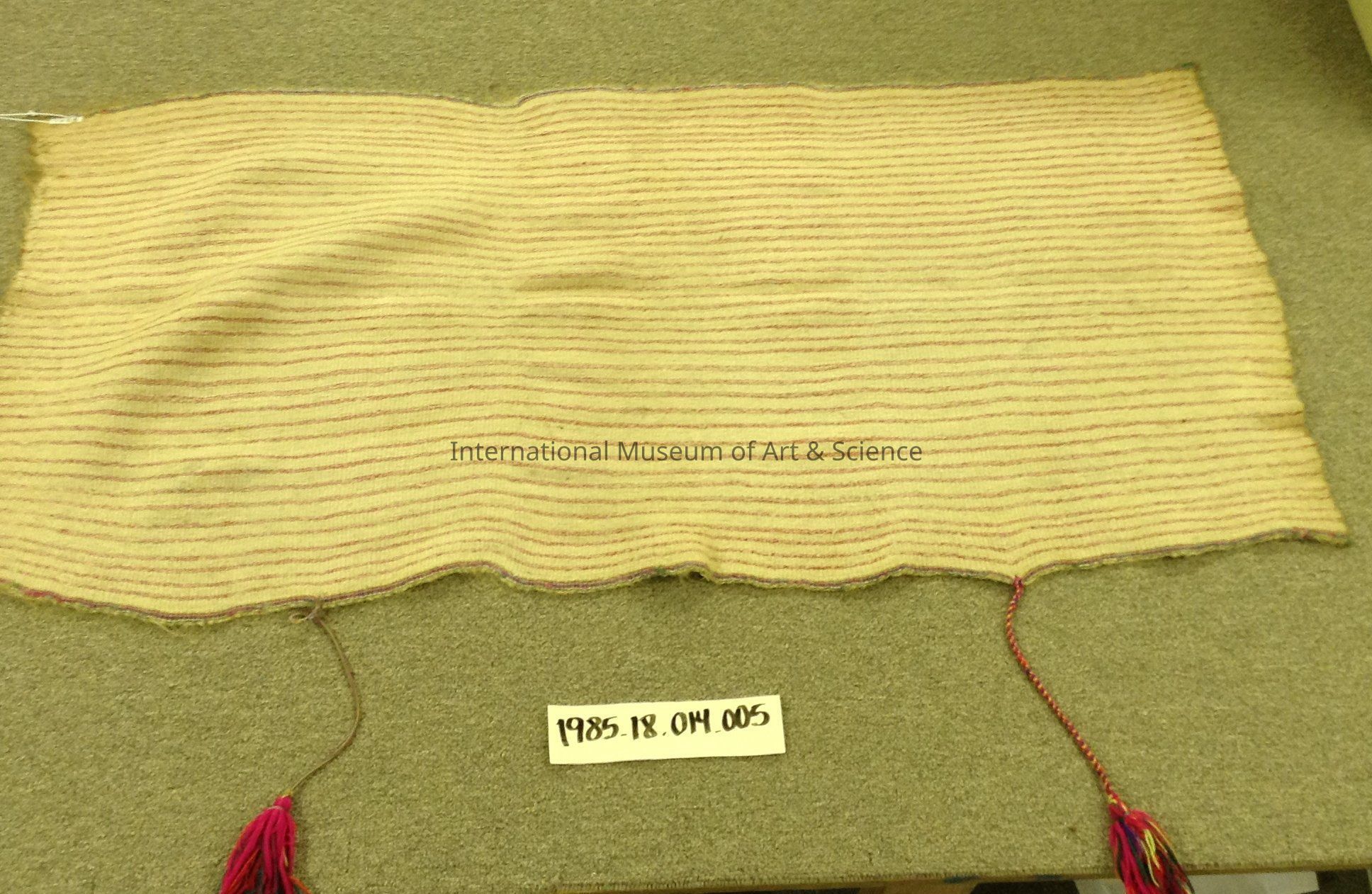 Woman's shawl. Overall natural cream background ; red horizontal bands; two multicolored bright mauve tassels/ pompoms attached.Artwork Details