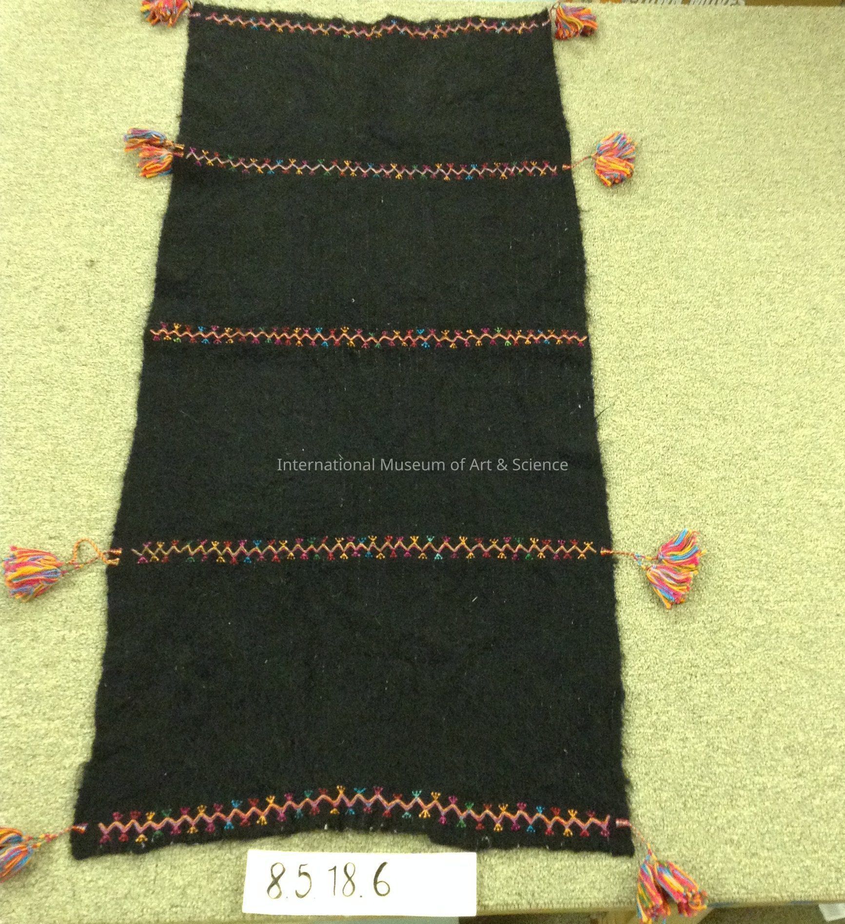 A woman's wool shawl. The shawl is overall black with multi-colored bands woven in with tassels/pompom decorations at the edge.Artwork Details