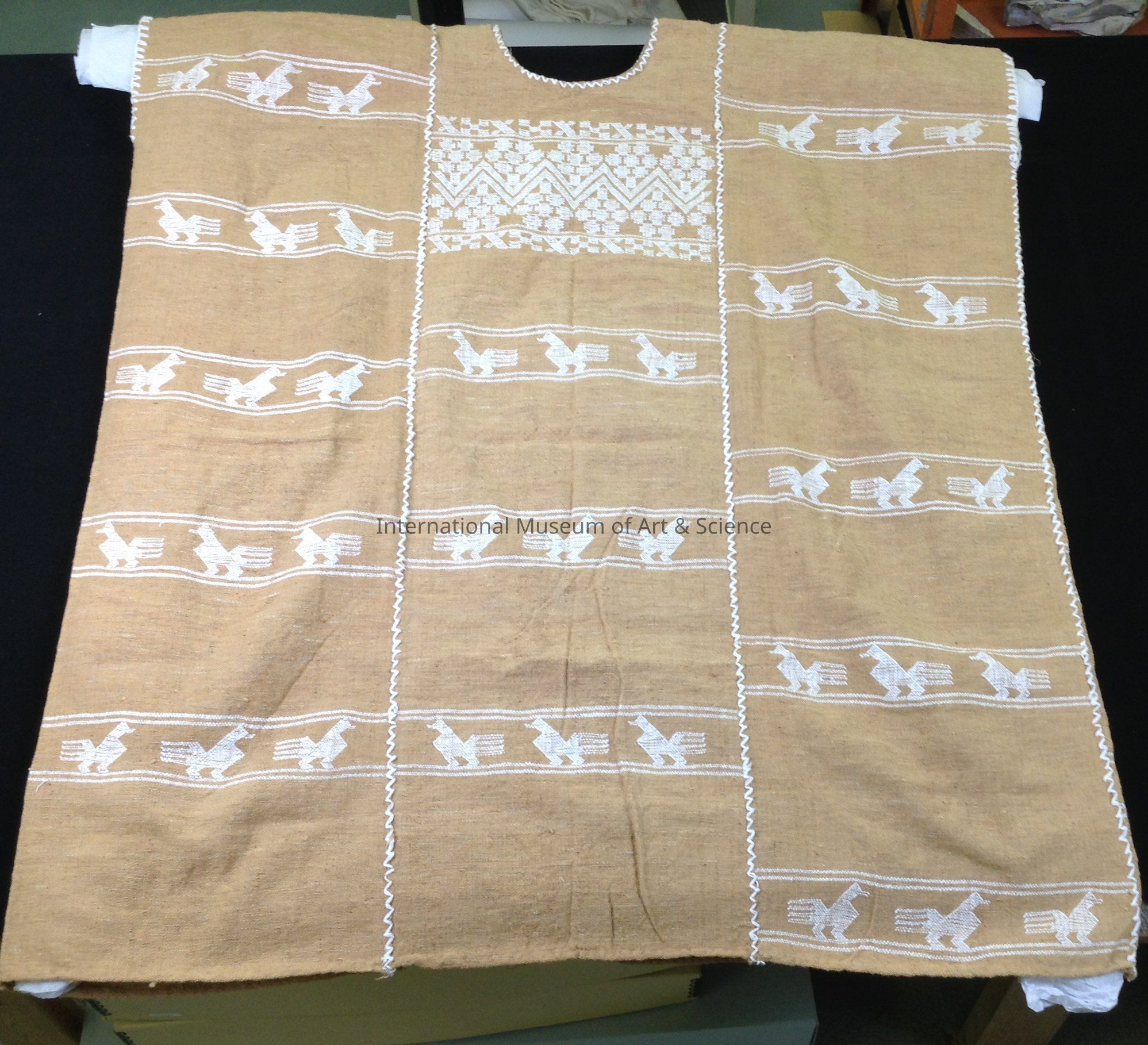 Huipil. Coarse weave, tan with white yarn; bird design and geometric pattern.