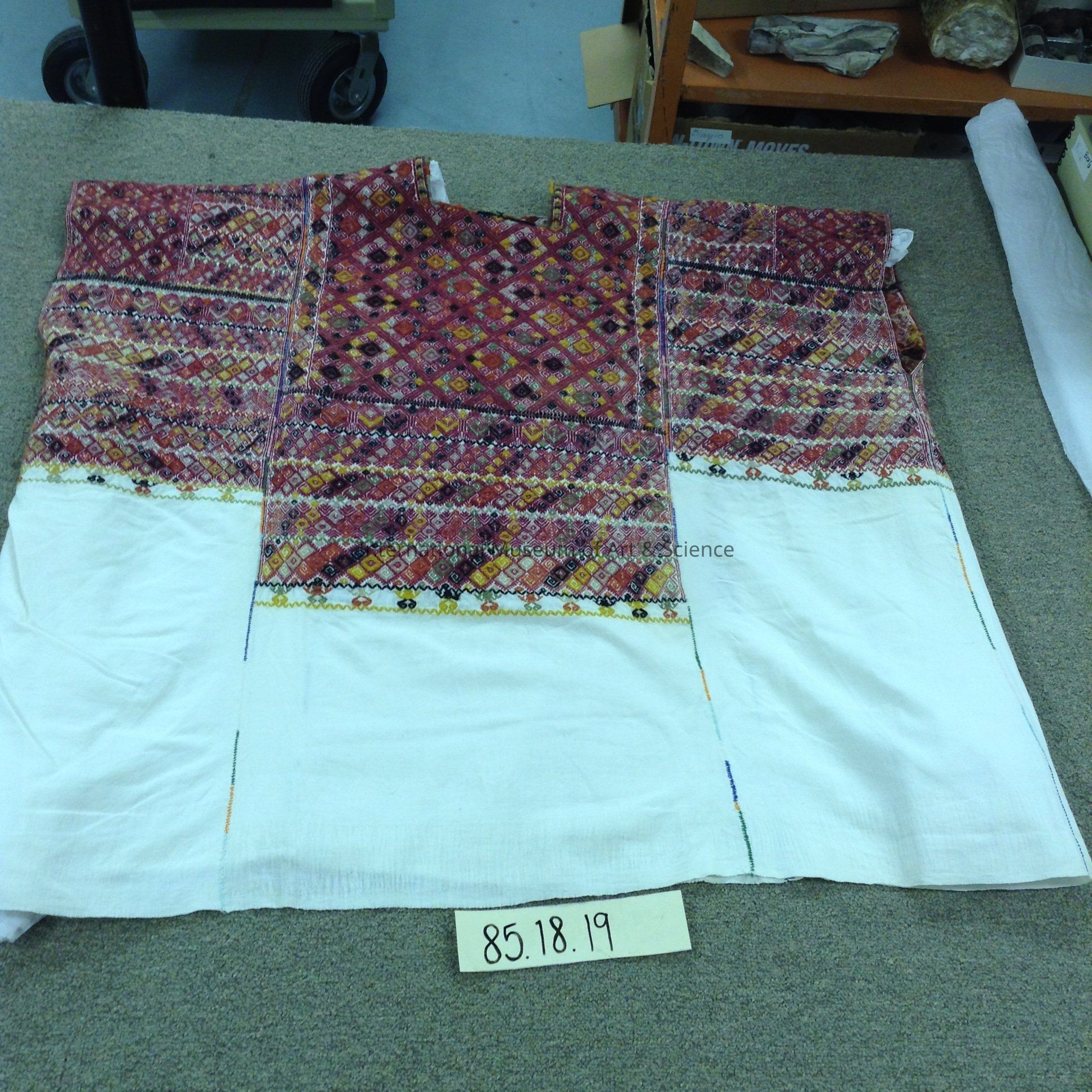 A white cotton huipil (shirt) with wool detailing. The top section is fully decorated with a maroon wool design and a multicolored diamond key pattern. The huipil has a square neck.Dimensions