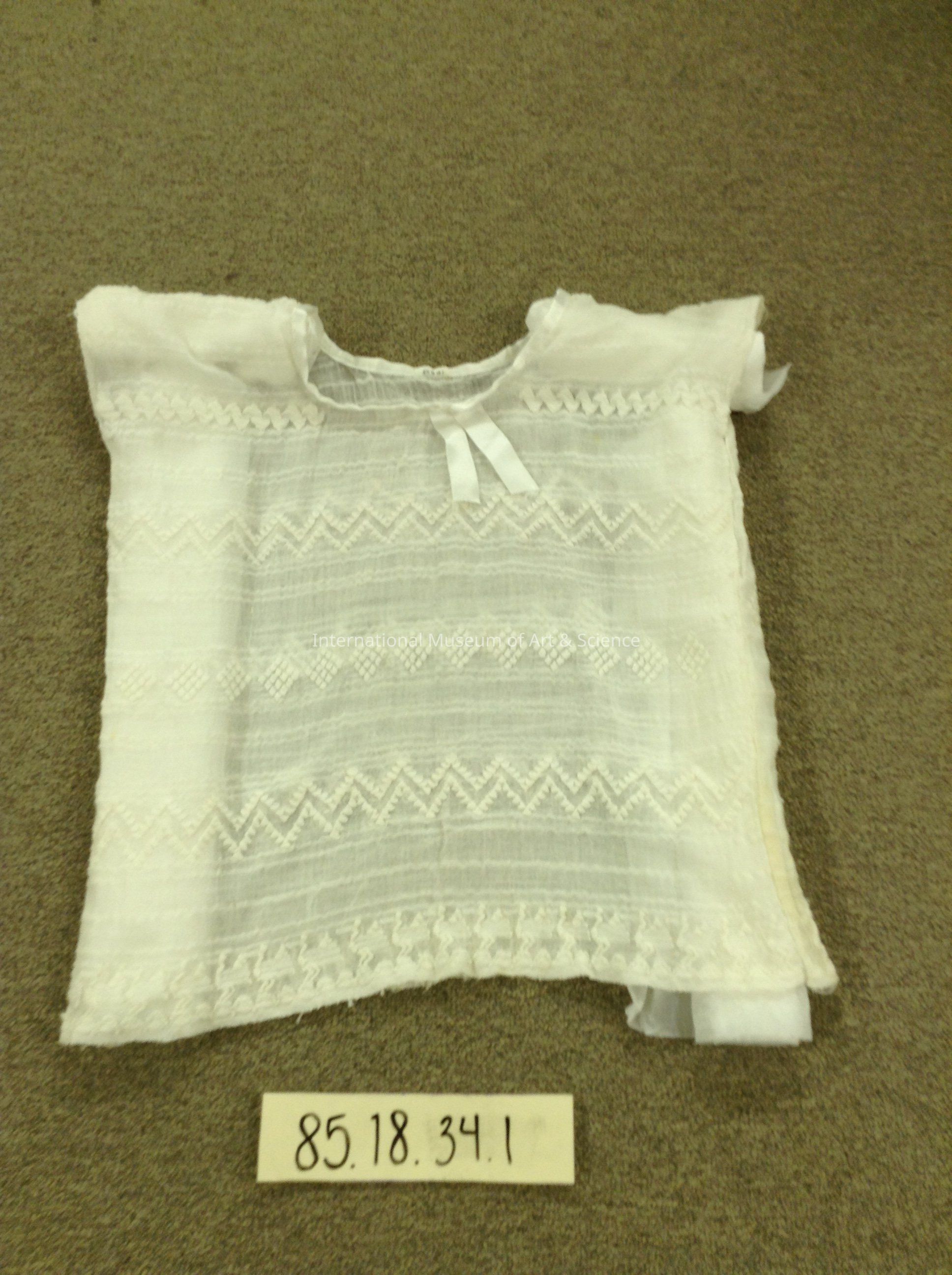 Blouse. Fine, light, and fragile white cotton blouse; diamond & zig-zag designs; rayon ribbon on neck; sleeveless.Artwork Details