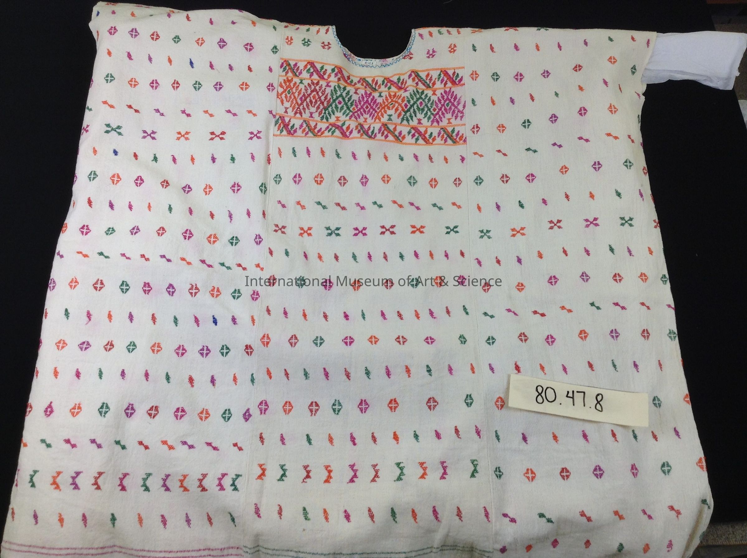 Huipil (blouse). Natutral tan cotton weave with a round neck and hand-sewn with colorful embroidery stitches in red, orange, green, and pink.Dimensions