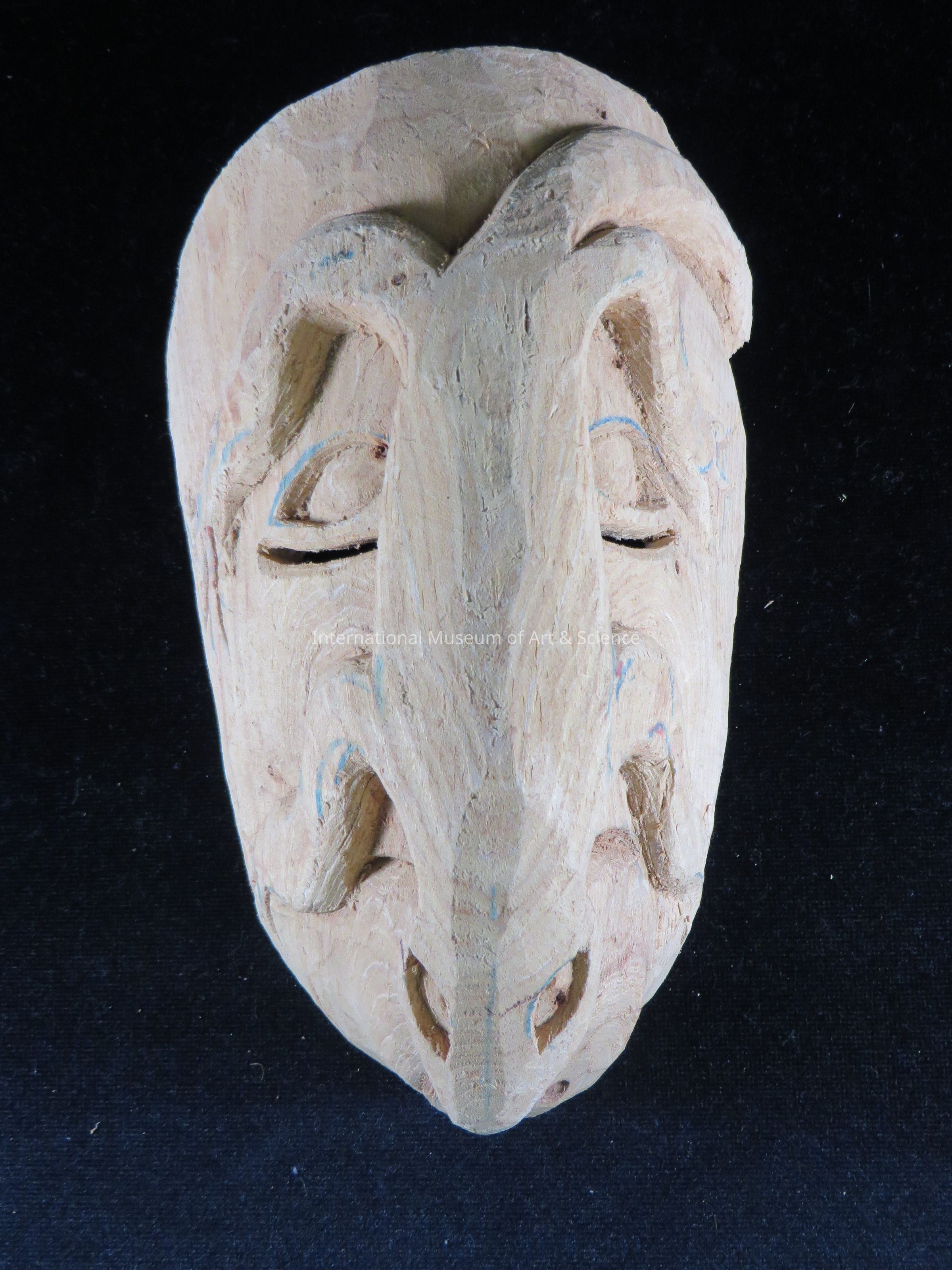 Siete Vicios (Seven Vices) character. Unpainted wooden carved mask of a man's face with a long lizard clinging in front.Dimensions