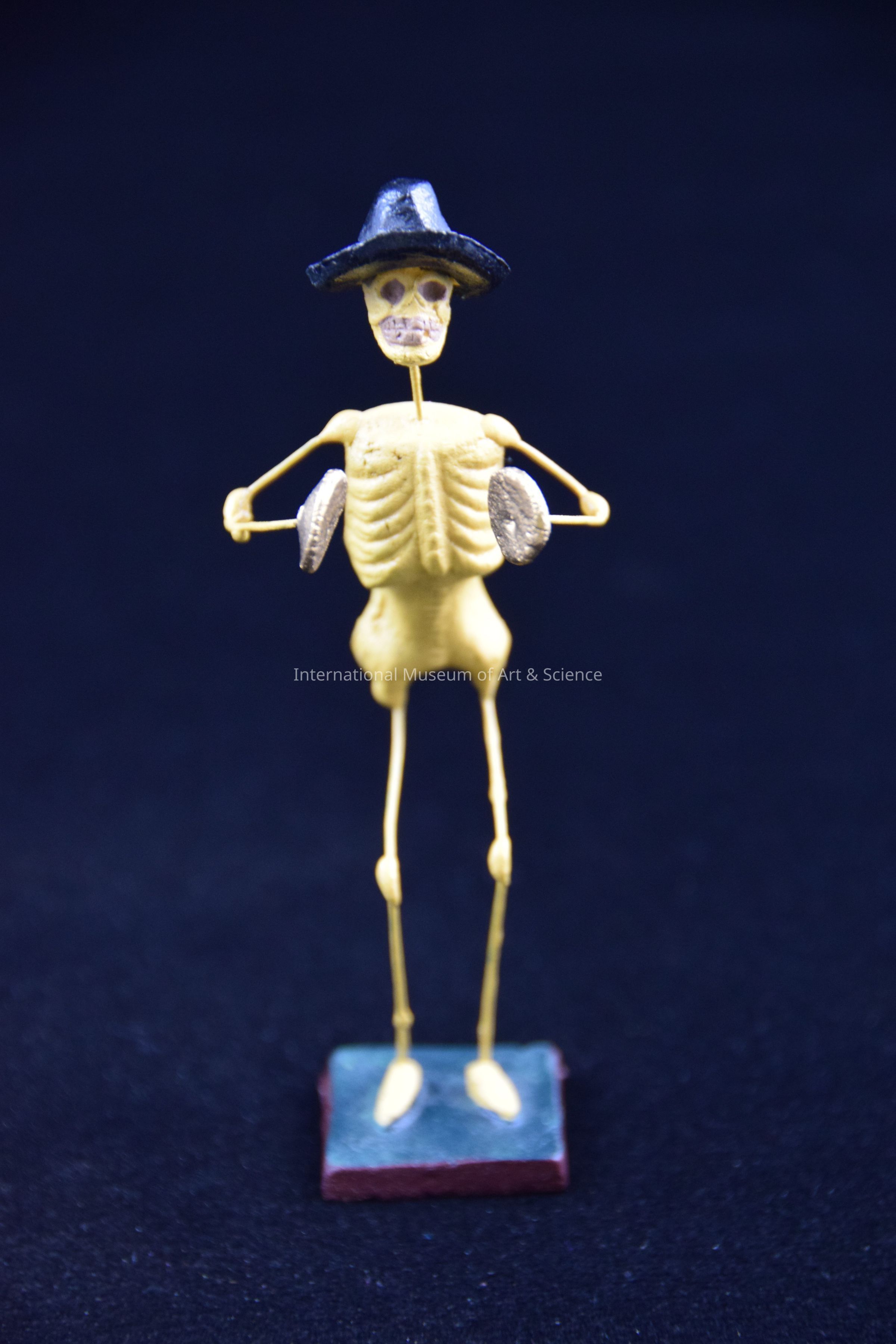A skeleton figurine with a hat on, playing cymbals. The figurine is part of a set of 10 mariachis musicans. The skeletal body is a dark cream color with brown skull eyes and mouth. The square base is painted dark green and brown.Dimensions