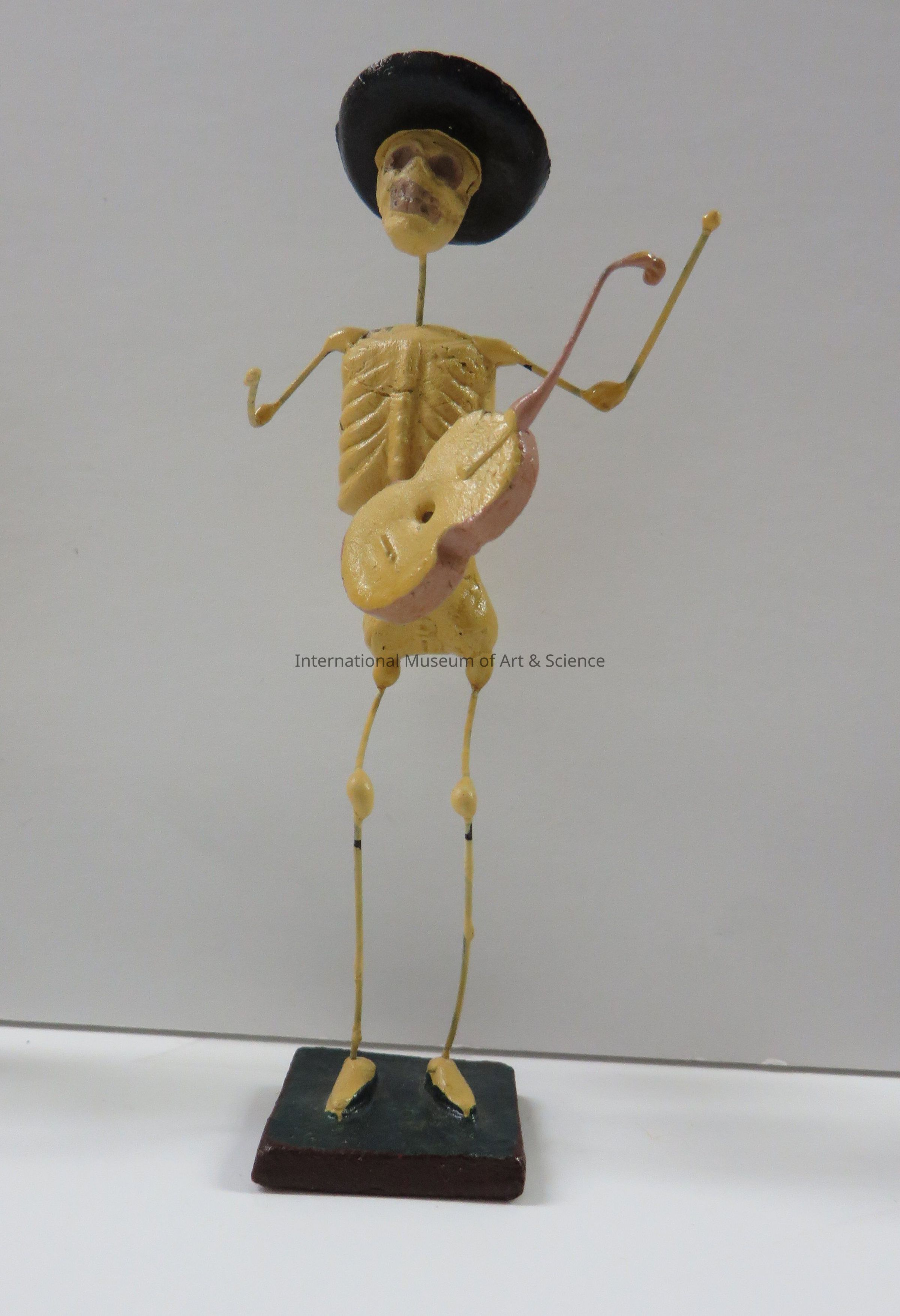 A skeleton figurine with a hat on, playing a guitar. The figurine is part of a set of 10 mariachis musicans. The skeletal body is a dark cream color with brown skull eyes and mouth. The square base is painted dark green and brown.Dimensions
