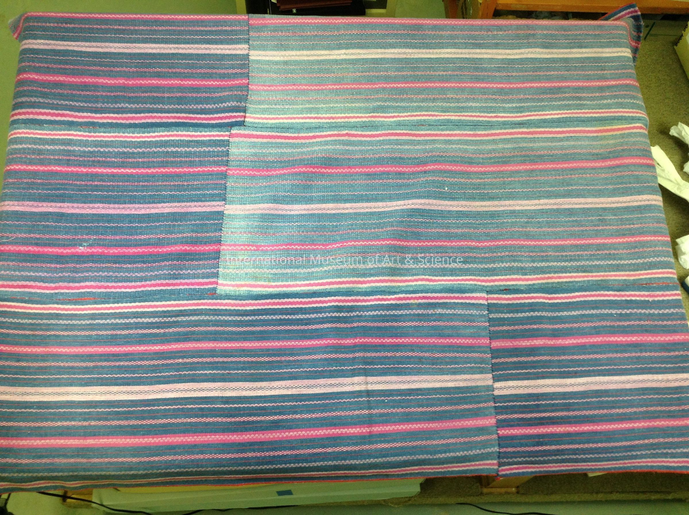 Posahuanco (wrap around skirt). Blue background; pink, purple, and red stripes.
