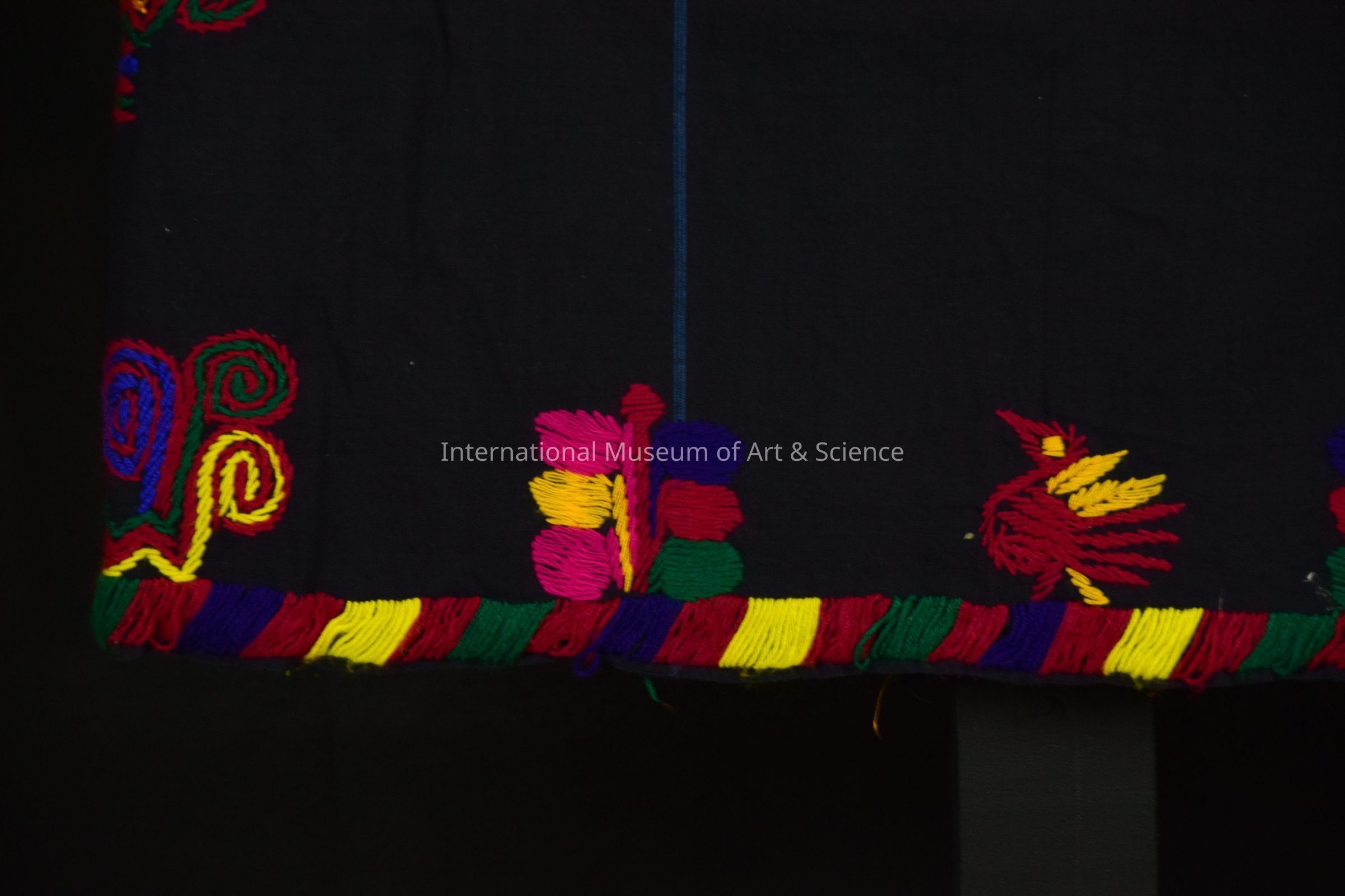 Skirt, Black cotton skirt; multicolored yarn bands - birds, flowers; blue indigo dye vertical bands.