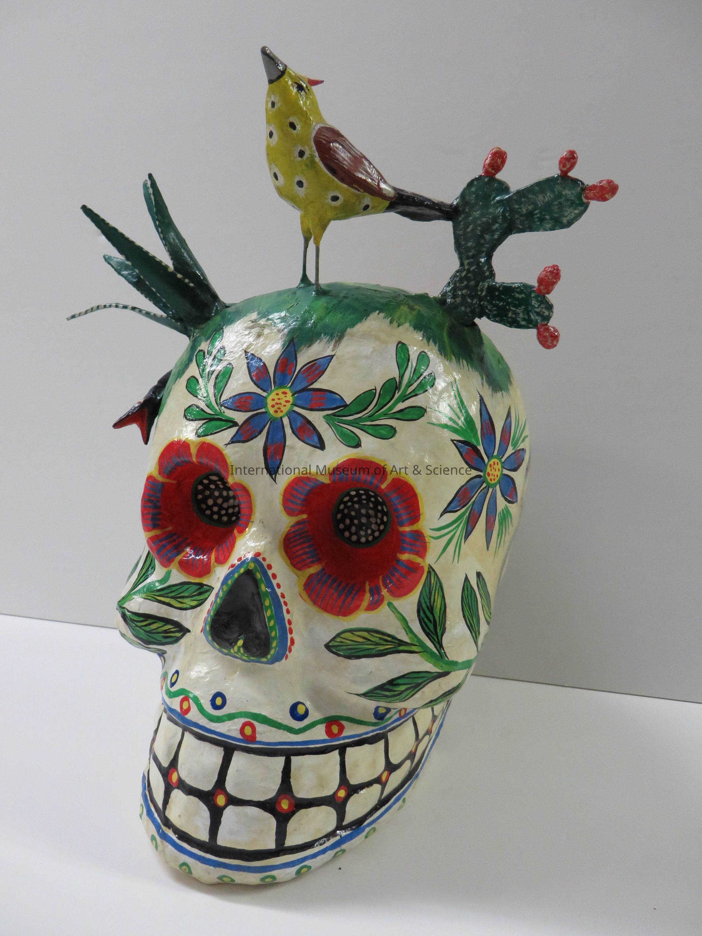A papier-mache skull. Overall white skull green leaves, multi-colored flowers; cactus plants, bird and snake on head; skull elaborately decorated; concave floral eye corners and central forehead with violet floral petal; white teeth.Artwork Details
