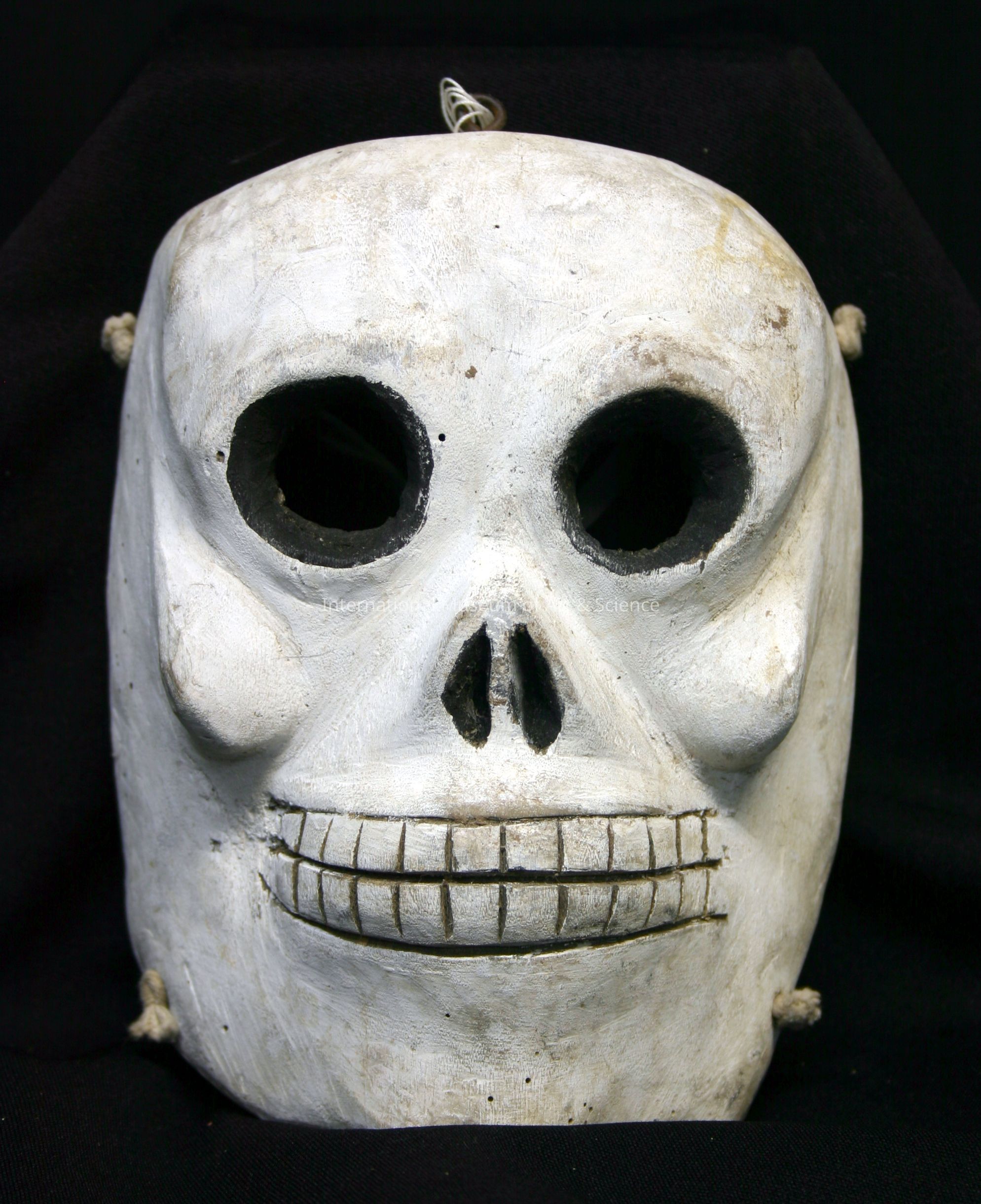 Skull Mask. White skull face with black circular cut eyes; black nostrils; white carved teeth; projected cheeks; white powder like finish.Artwork Details