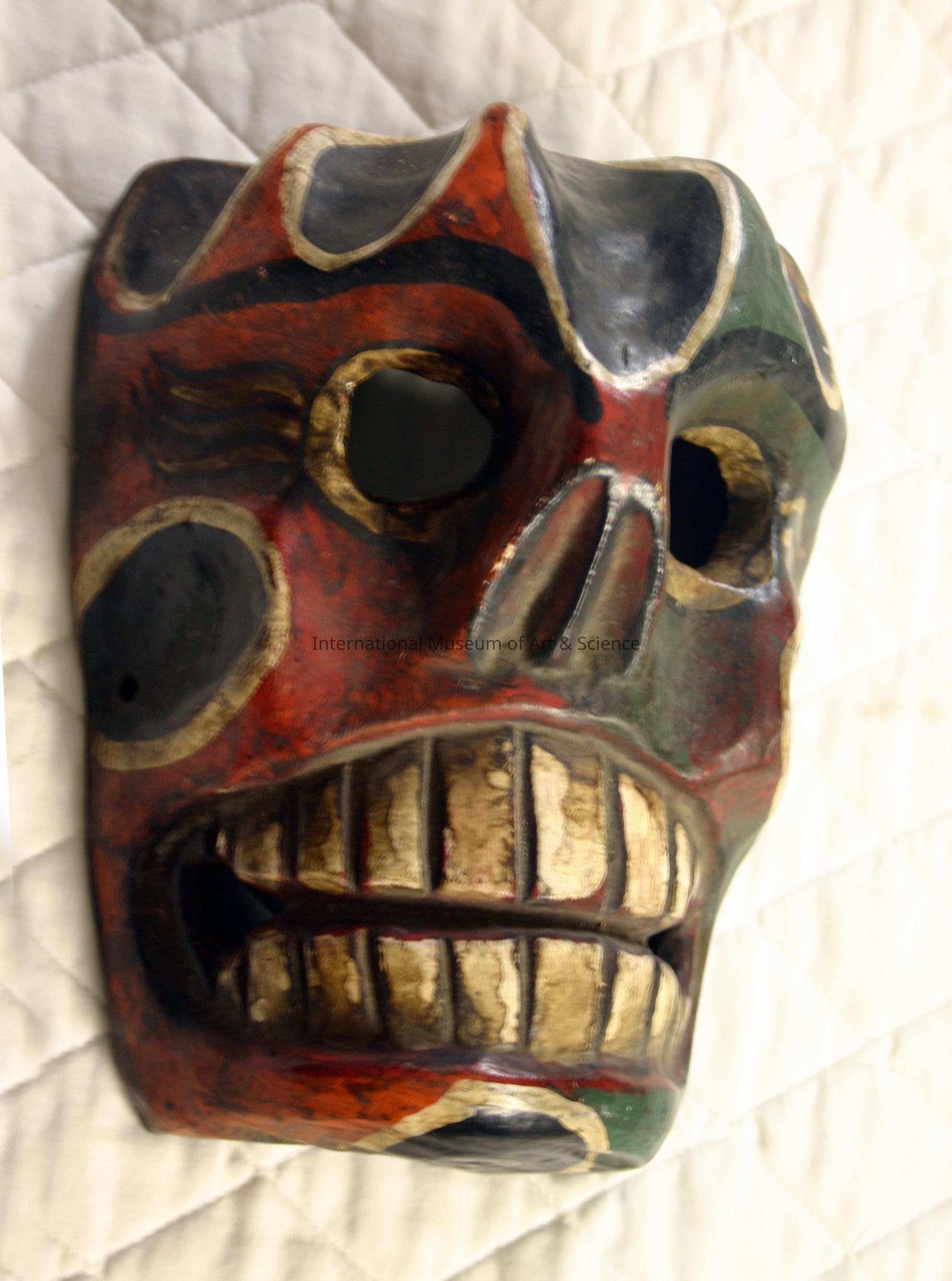 "Skull Mask". Round covered holes as eyes painted cream with three stripes; concave oval nostrils painted red outlined in black; concave cheek bones painted black outlined in cream; large oval mouth with carved teeth painted white with brown stains, two holes; mask overall painted red and green combined, [darkened patina probably chemically-produced] soft wood- probably zomptleDimensions