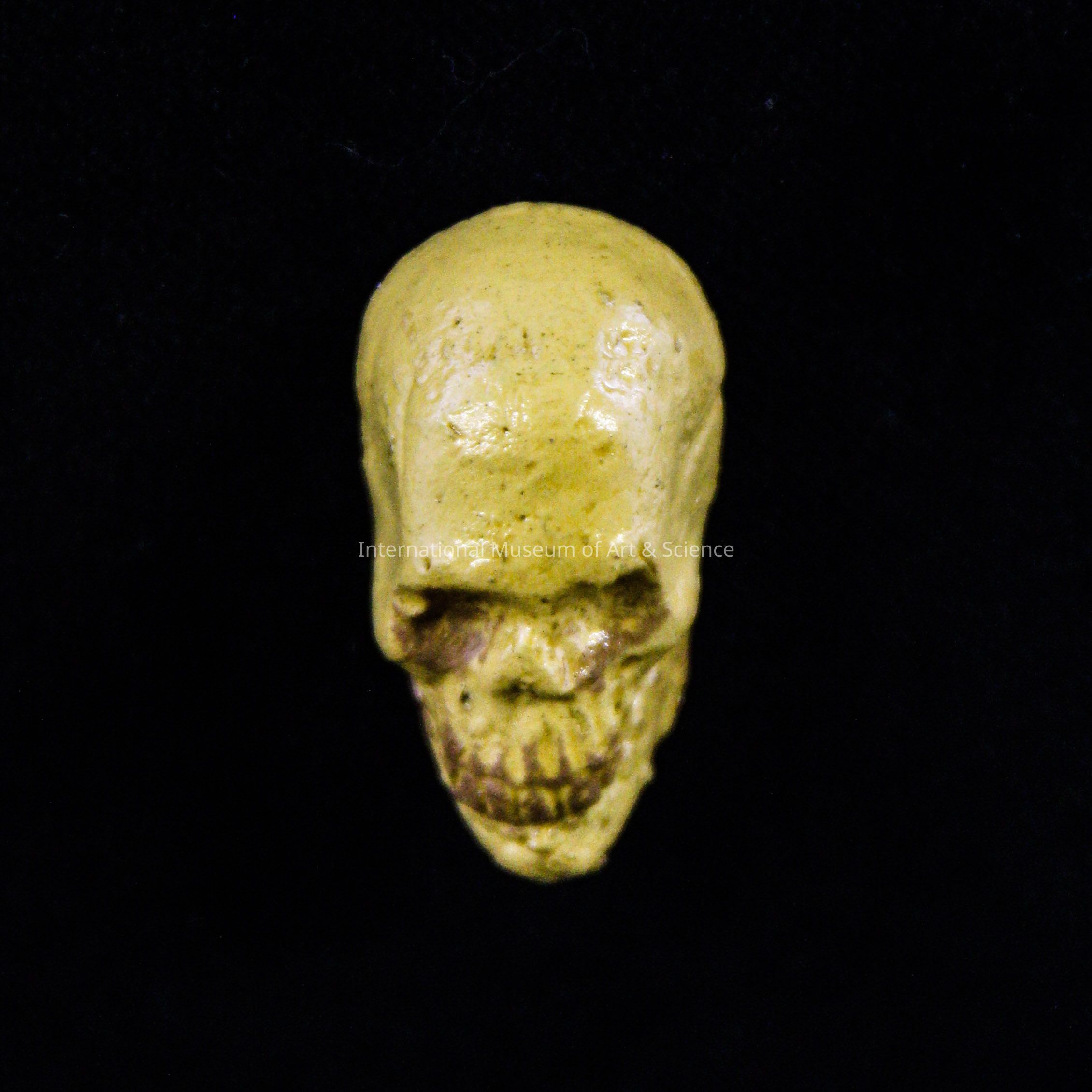 A small skull pin. The skull face is painted dark beige with touches of brown for the eyes and teeth. There is a wire attached to the back.Dimensions