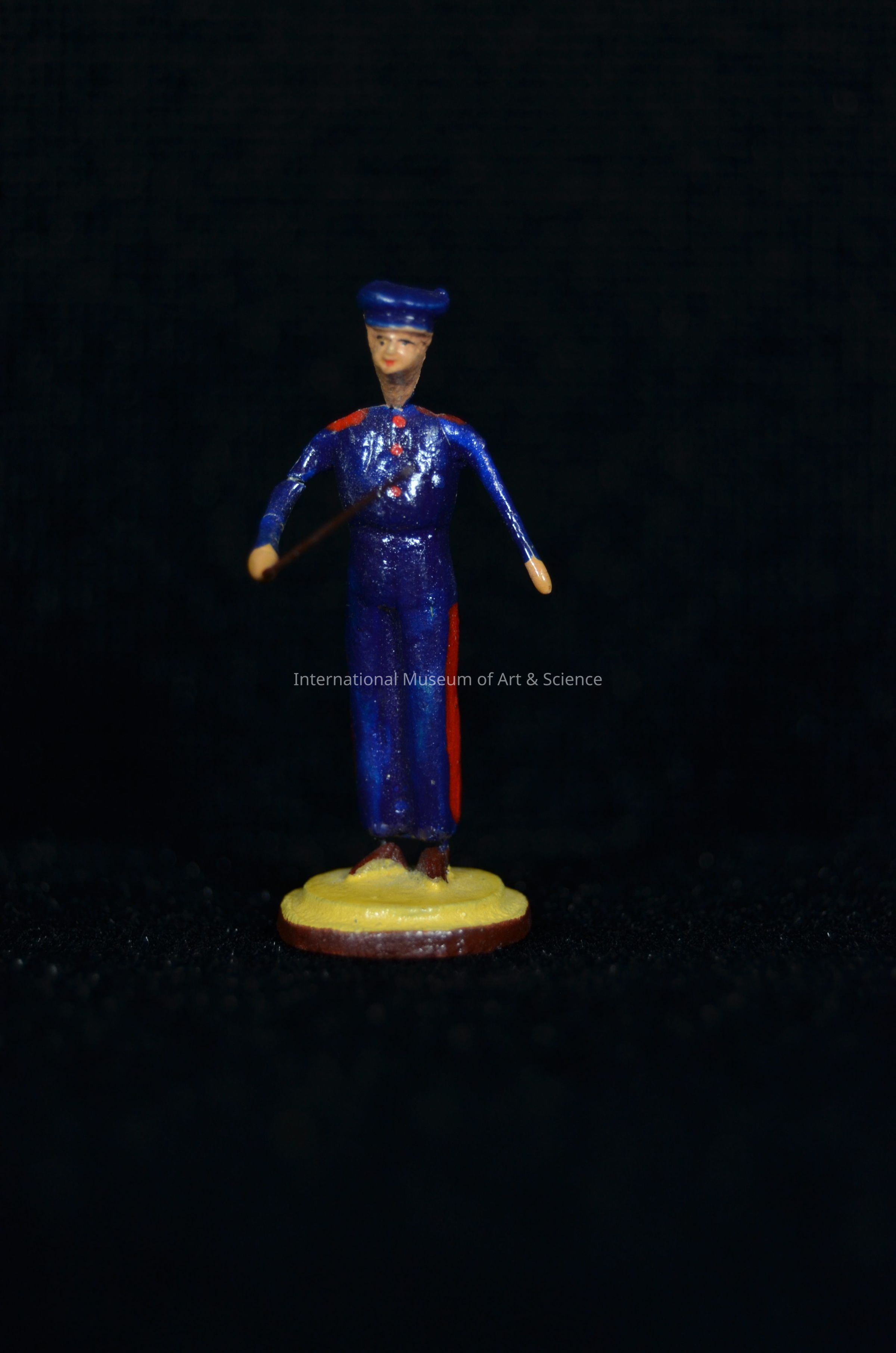 A miniature figrine of a standing solider on a round base. The soldier' is wearing a dark blue cap, shirt and pants with red stripes and buttons. He holds a wire stick in his right hand. The round base is dark beige and brown.Dimensions