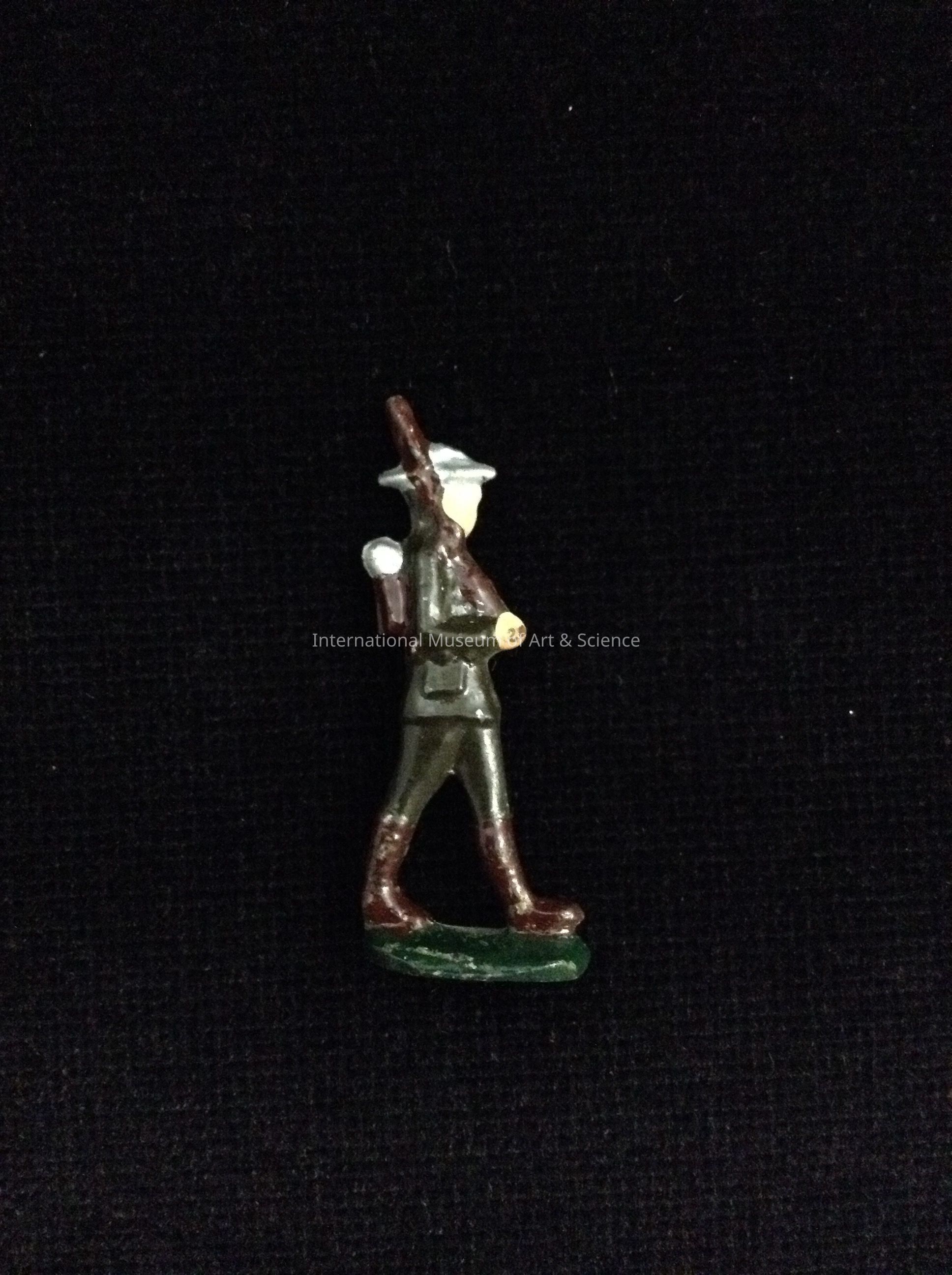 A miniature toy soldier. The soldier is made from a linotype metal (pot metal), cast in a mold. The soldier is cast as one piece. The figurine is decorated with paint. The figure is standing in a green uniform, a silver cap and gear, holding a brown rifle over the right shoulder.Artwork Details