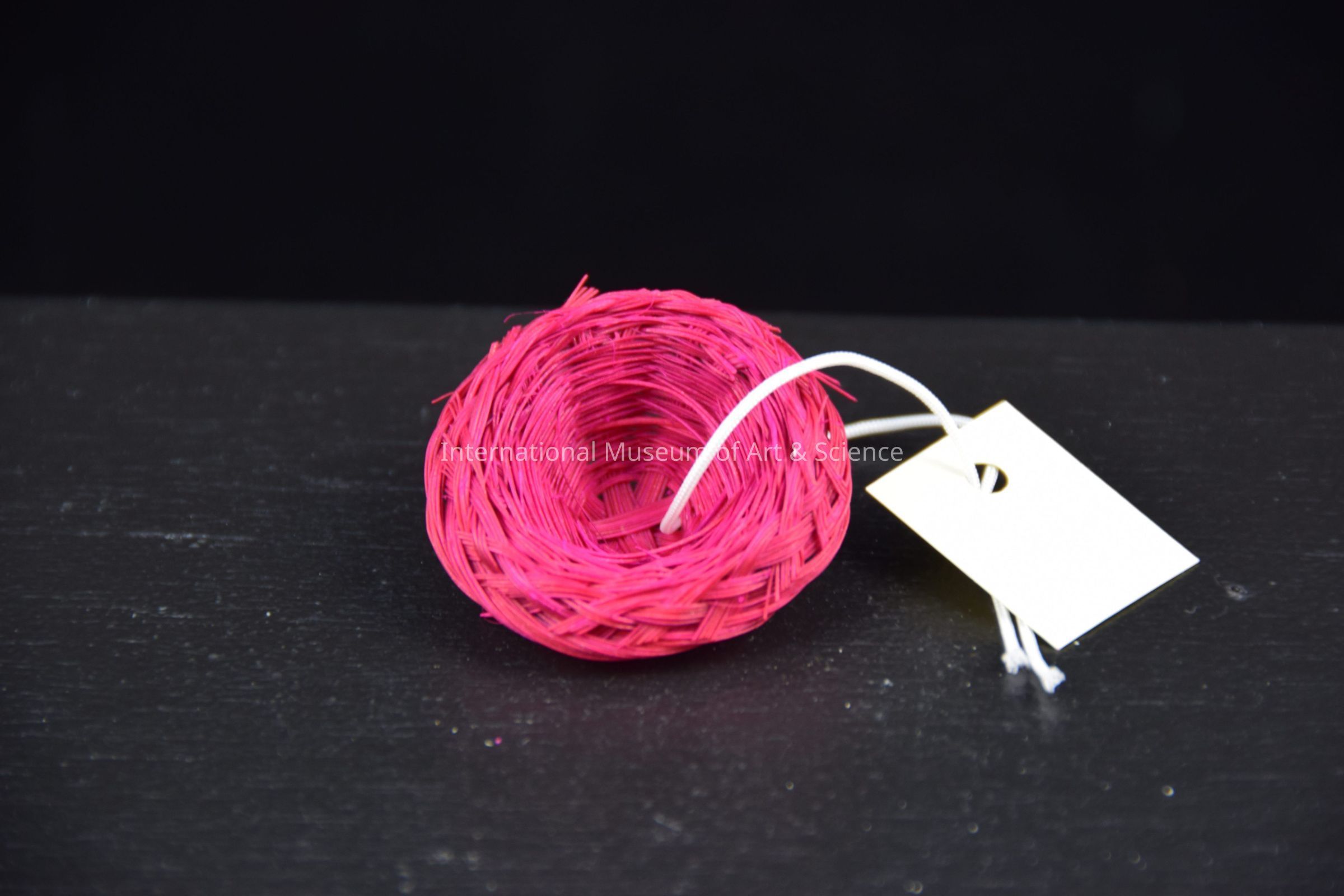 A miniature sombrero woven out of ixtle. The ixtle has been dyred a dark pink.