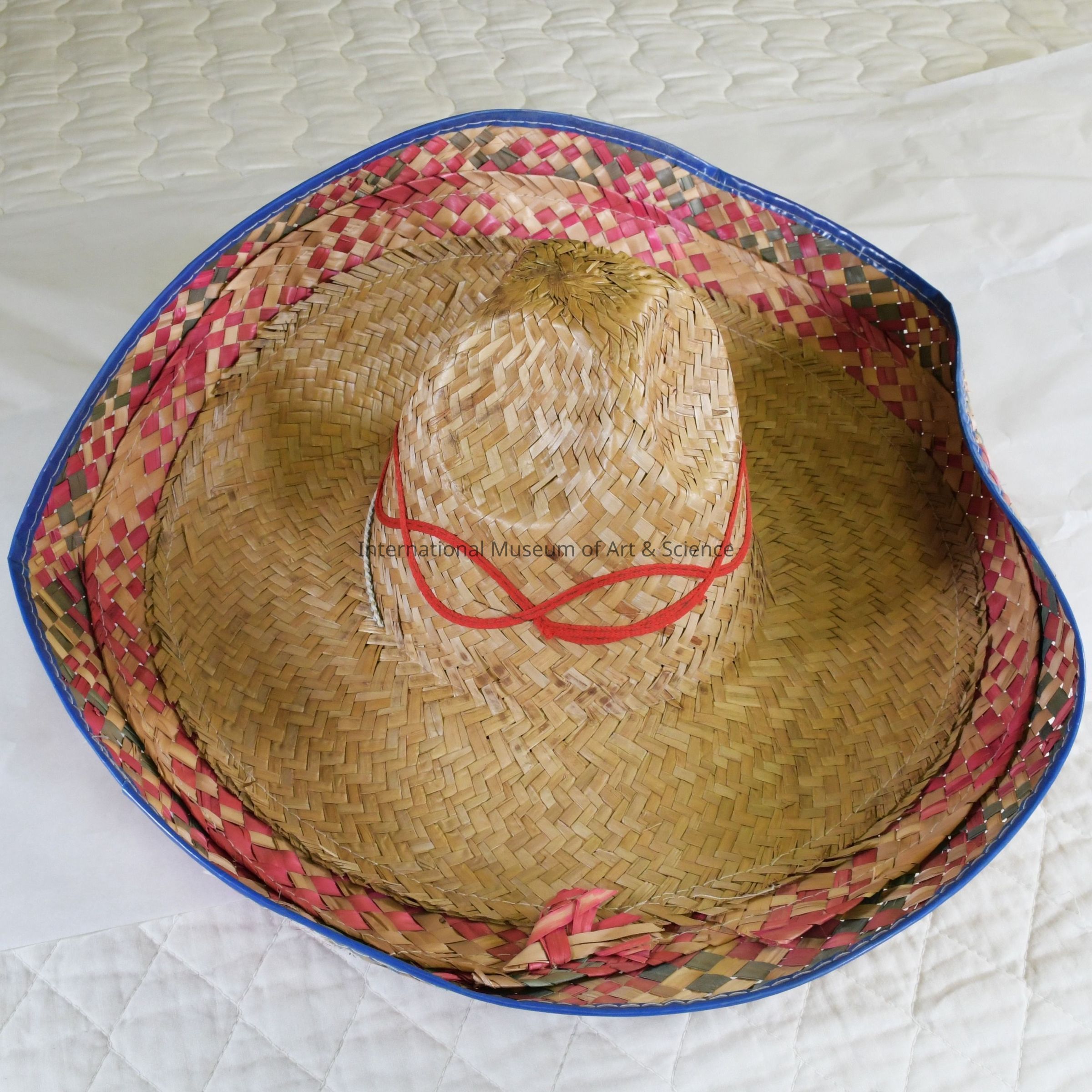 This wide-brimmed hat is woven from natural palm fiber using a diagonal twill plaiting technique. The crown is tall and conical; a thin twisted cord in red and white encircles the base of the crown, tied loosely at one side.