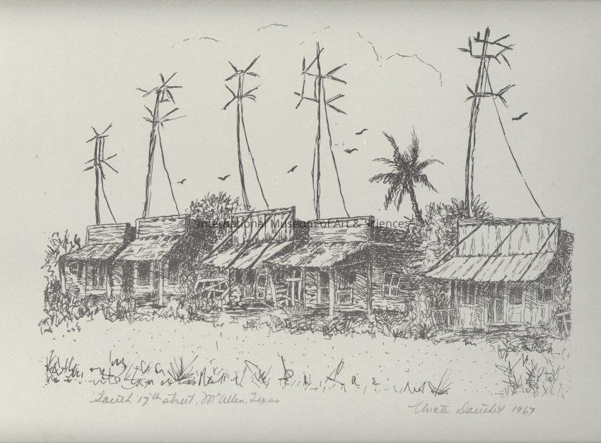 "South 17th. Street, McAllen, Texas." Depicts five dilapidated houses, antennae above each. B) Black on gray paper. Copy 2 of 2.Dimensions