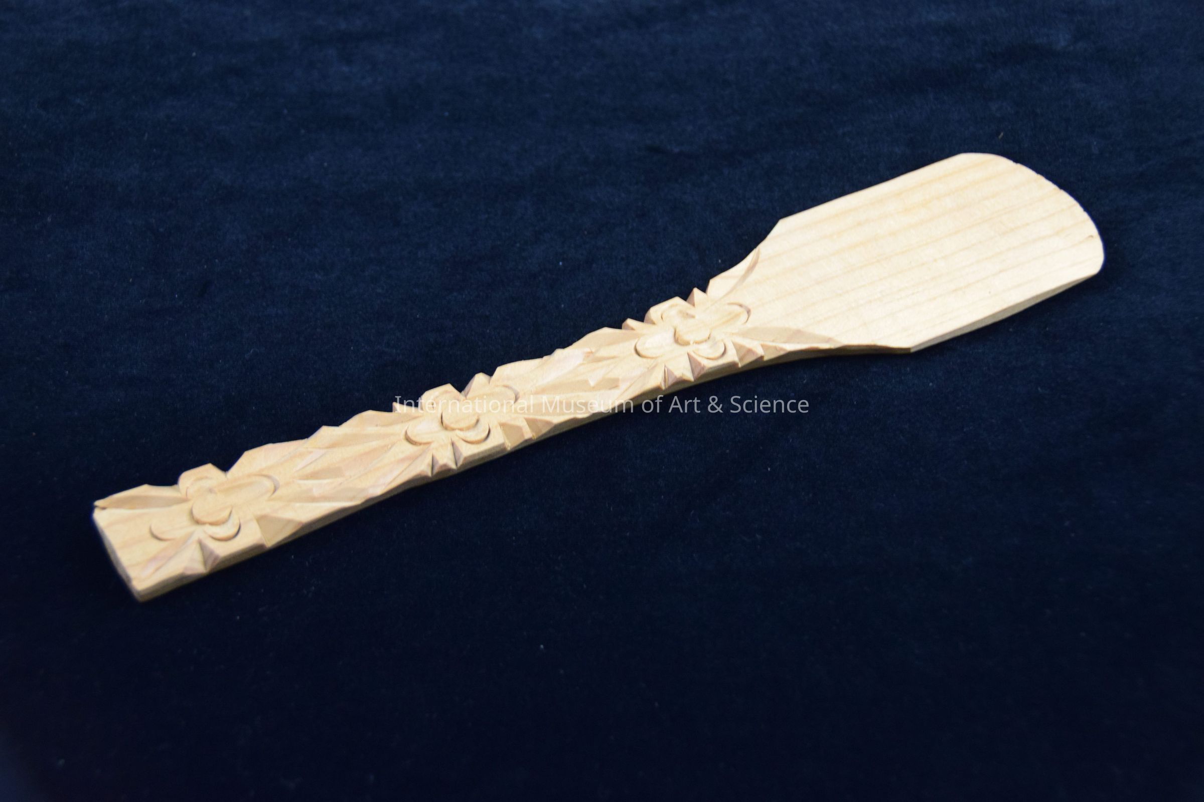 A hand-carved wooden spatula. The spatula has an elongated handle with a flat head. There is a floral motif carvings on handle. The piece is unpainted.Made/Created