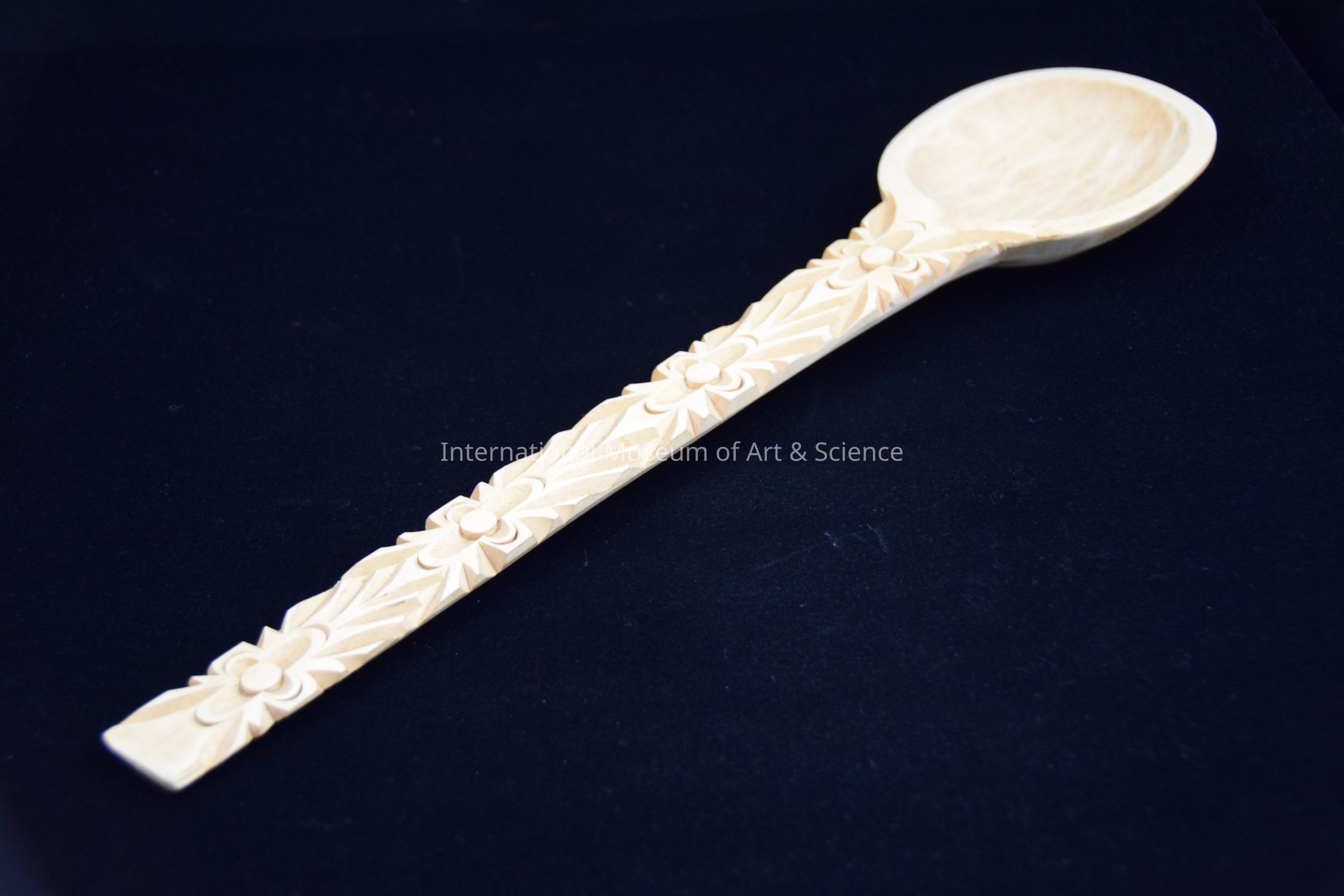 A hand-carved wooden spoon. The spoon has an elongated handle with a concave oval head. There is a floral motif carvings on handle. The piece is unpainted.Made/Created
