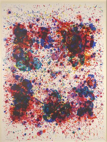 "Spun for James Kirsch". Sam Francis, American. Silkscreen on paper. 1972. Framed; 7 color screen print: green-blue, red violet, yellow, blue, pink, orange, violet; tusche screens hand-drawn by the artist.