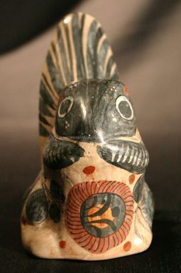 A ceramic figurine of a squirrel. The body of the animal is tan and it decorated with orange, grey, and black floral designs. The animal is sitting upright on with its front paws at its mouth. It has a black head with orange ear accents. The tail is upright with black and dark grey linear design details.Dimensions
