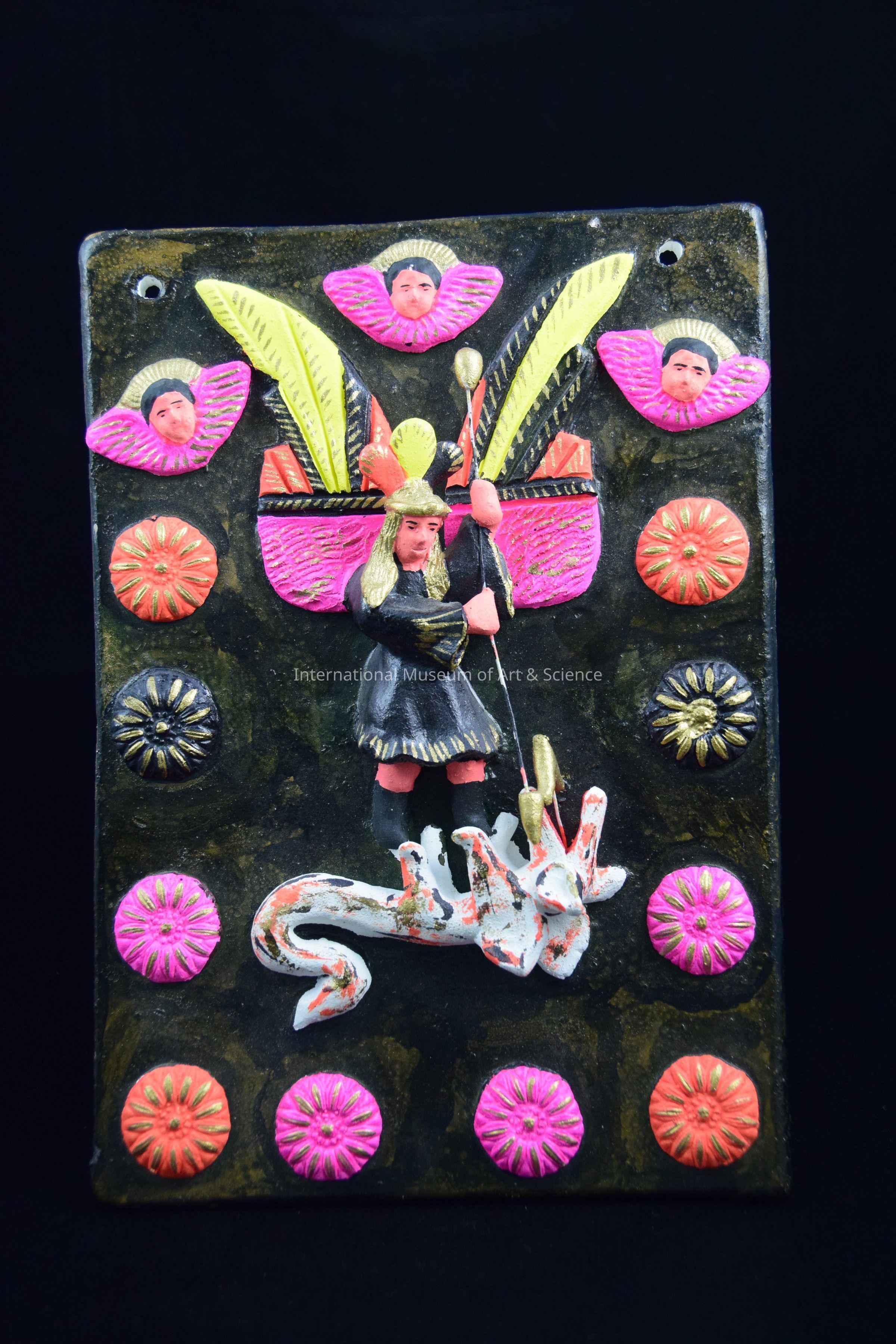 A ceramic plaque depicting St. Michael the Archangel defeating a dragon-like beast. The piece is also decorated with bright orange and pink flowers with gold and three angels with pink wings on topMade/Created