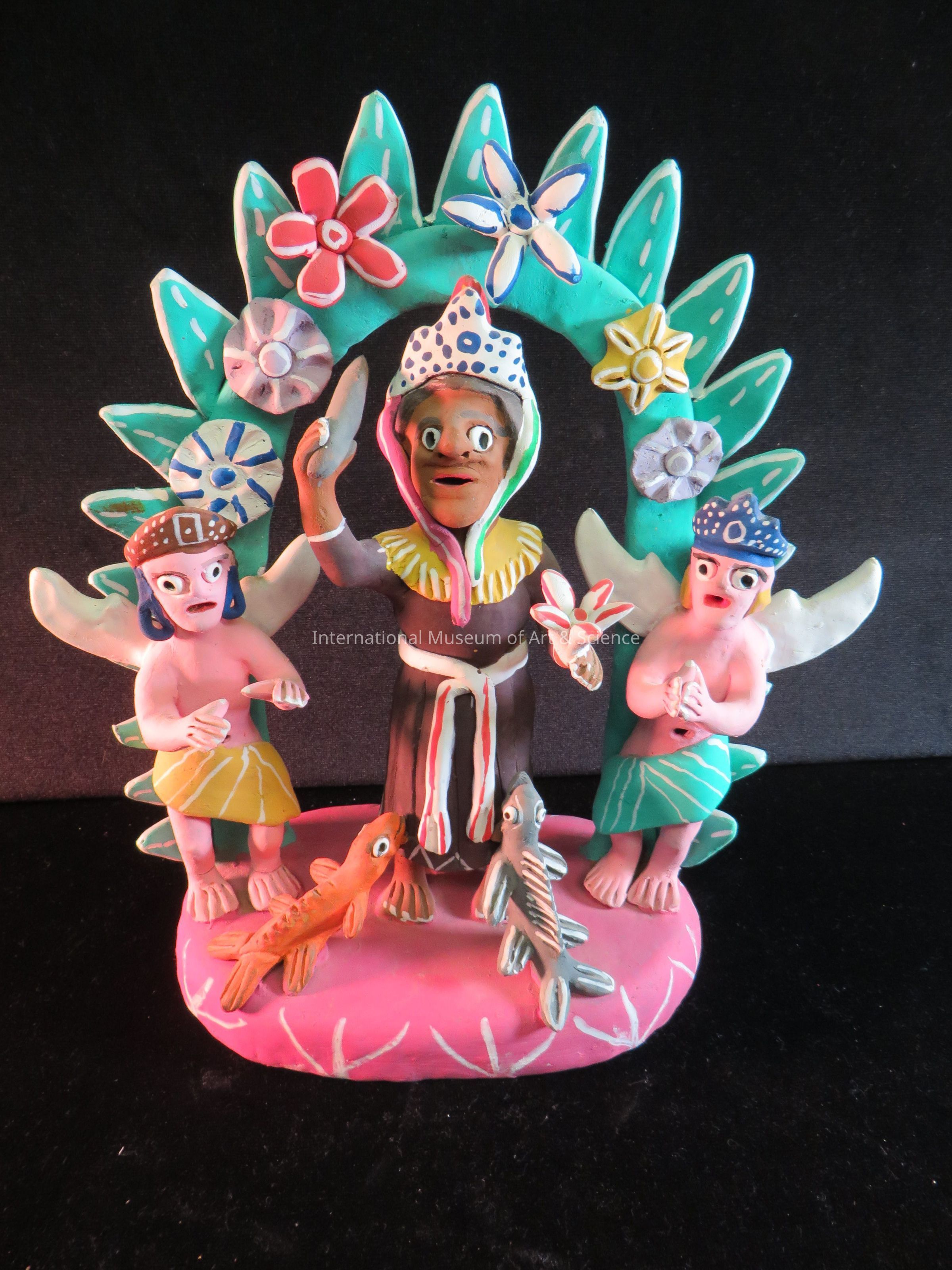St. Raphael Sculpture. St. Raphael figure with dark brown flesh color; stands under green arch with multicolored flowers; pink angels with white wings; orange and gray animals below.Made/Created