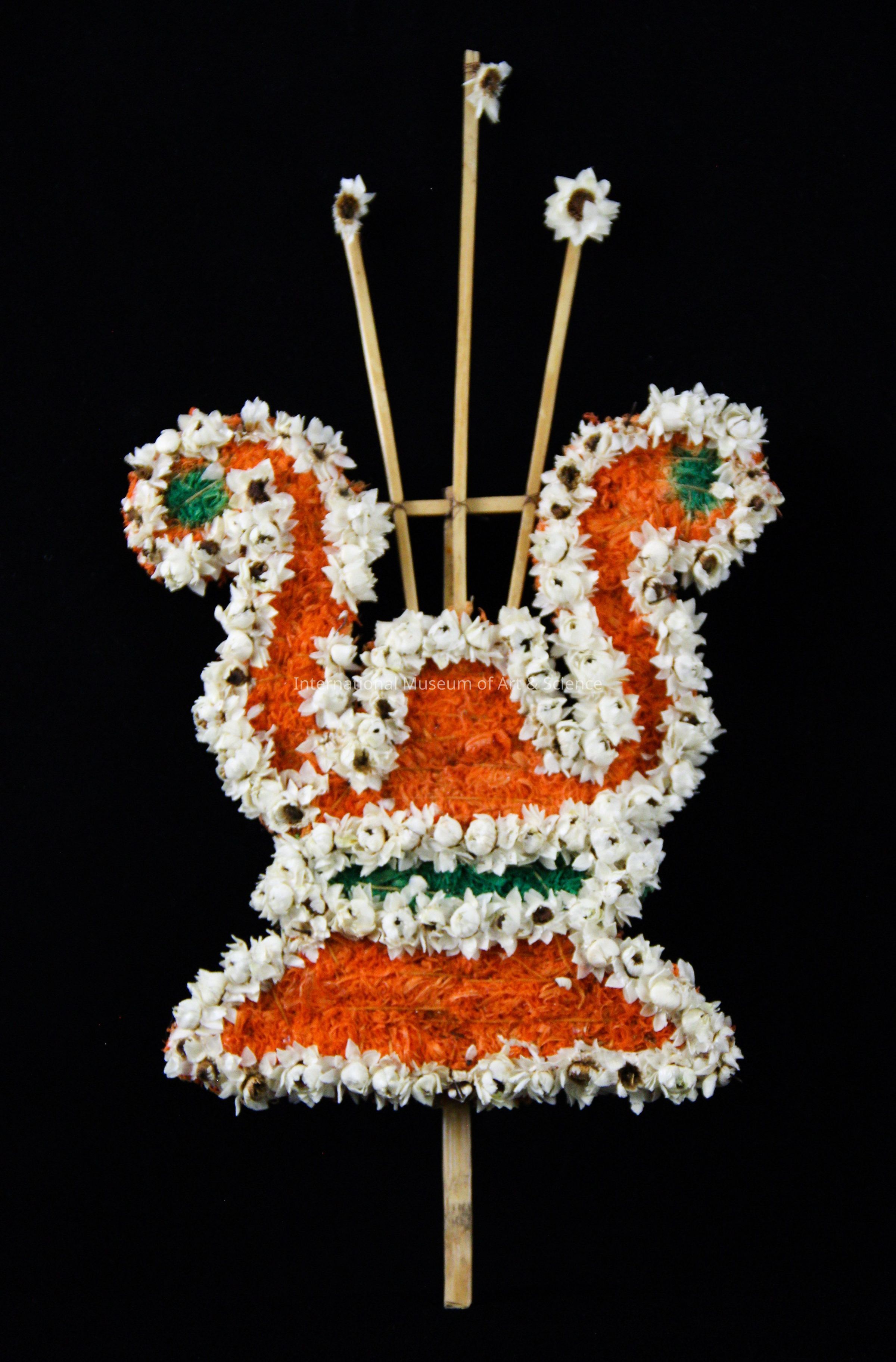 A dried flower standard. The standard has a bamboo stem with the curvilinear top decorated with many dried flowers. The standard is shaped like a lyre.Artwork Details
