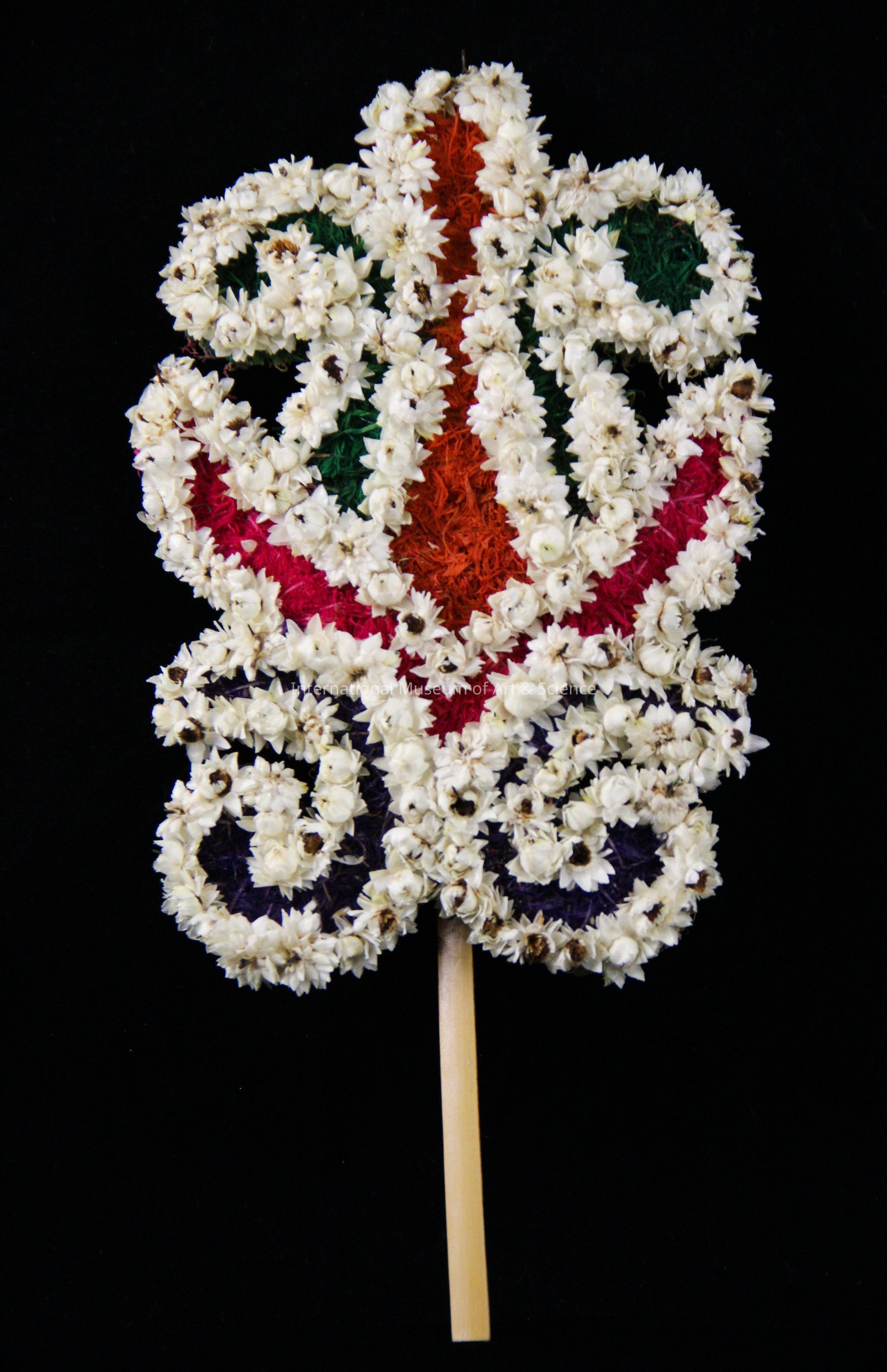 A dried flower standard. The standard as a bamboo stem with the curvilinear top decorated with many dried flowers.Artwork Details
