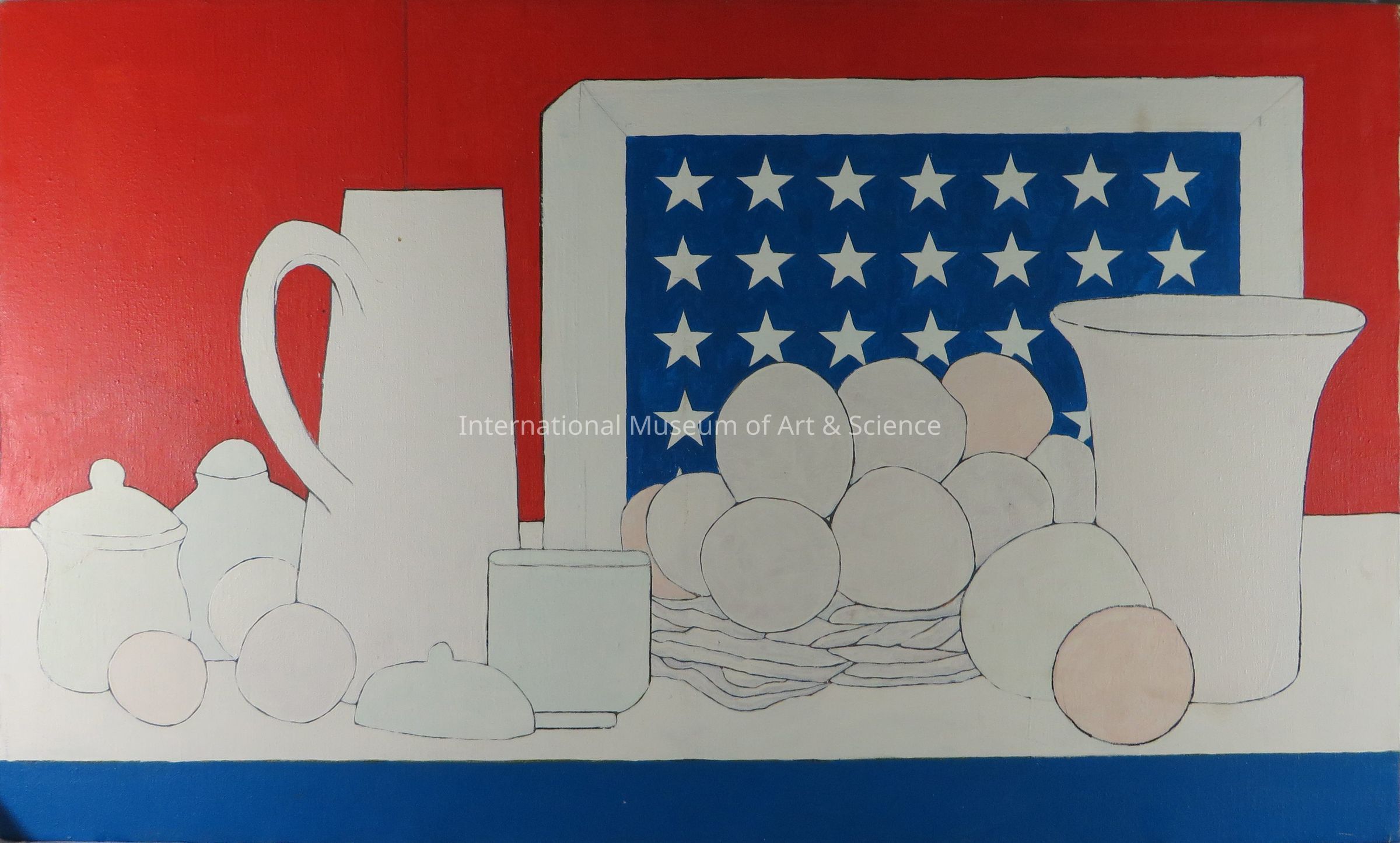 "Star Spangled Still Life" - White shapes on red and blue starred back ground.Dimensions
