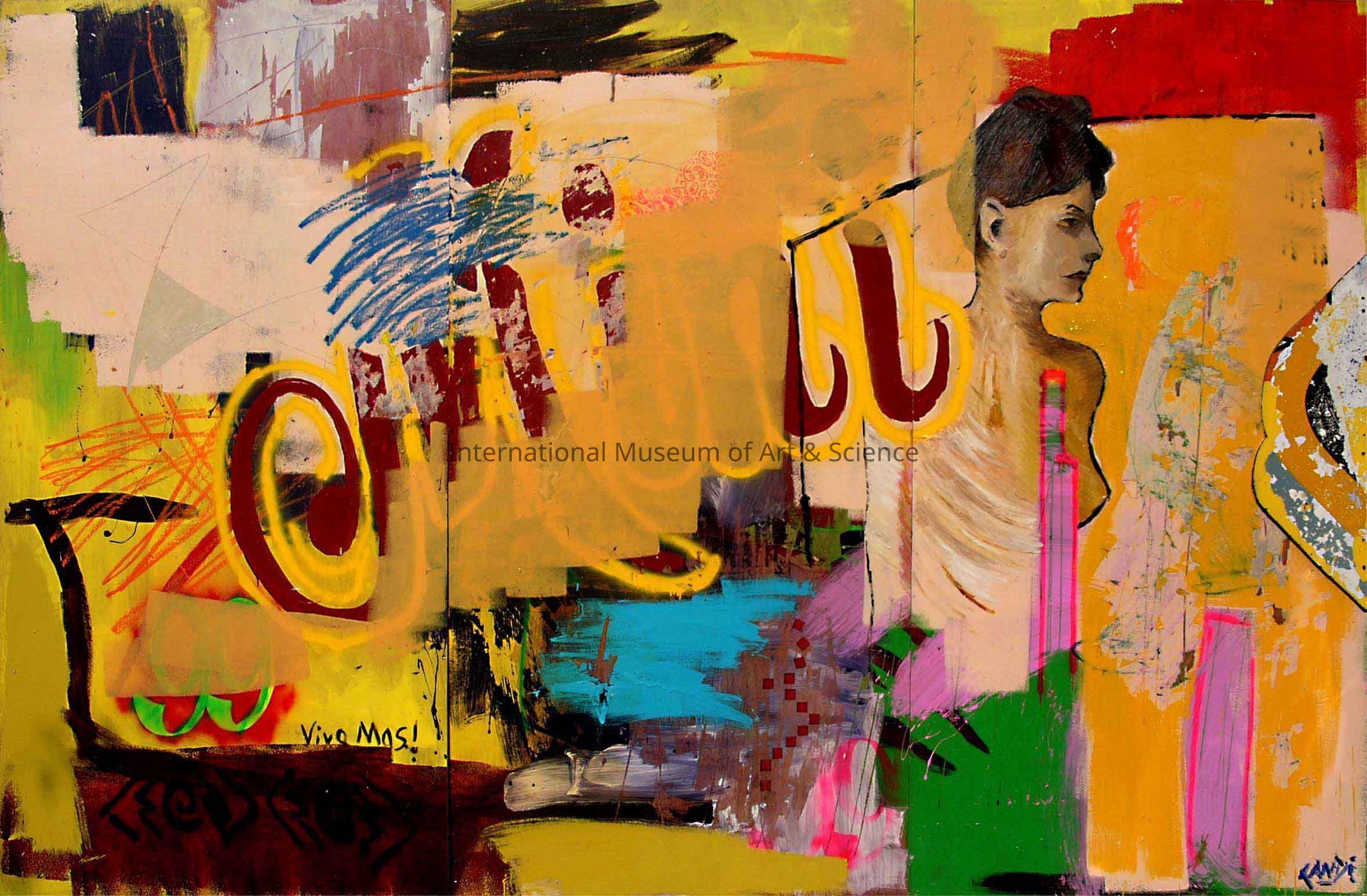 A triptych painting. The semi abstract painting is done on three panels. It depicts a female form, writing, along with abstract shapes.Artwork Details