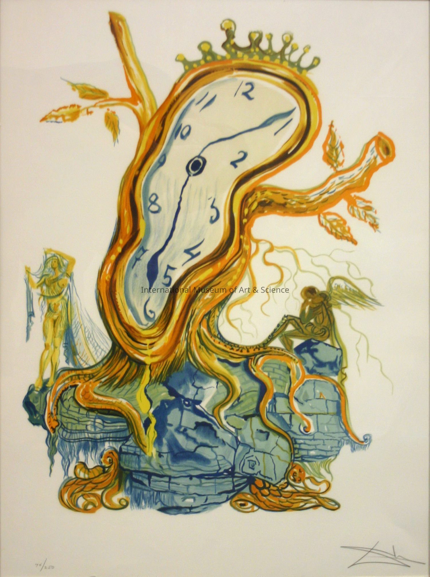 "Stillness of Time". Large, oval, curved clock of orange, yellow, and brown; has yellow crown on top, leans over tree with branches and roots and leaves; female standing at left and another figure at right with attached wing; clock has wavy hands and blue numbers; clock is located on wall of light and dark blue with two orange curvilinear figures, human-like at bottom; signed.Dimensions