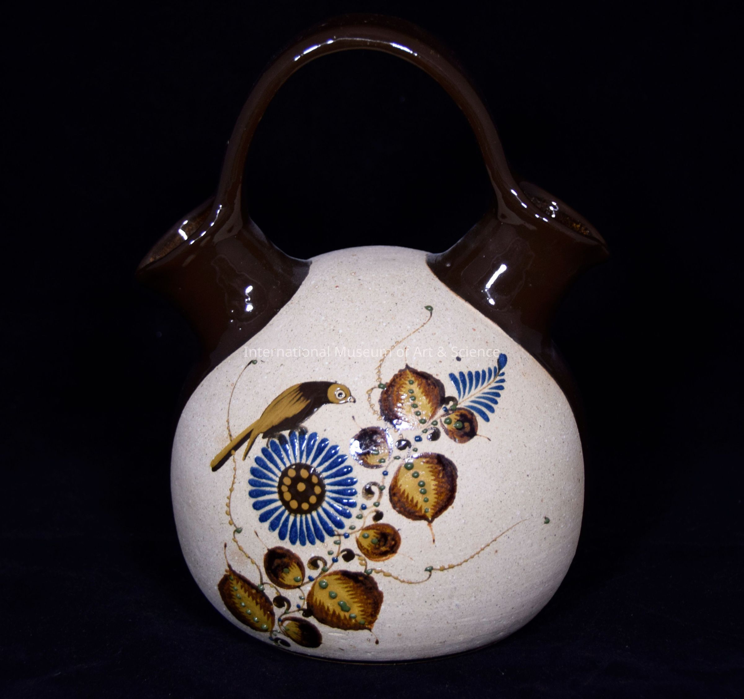Stirrup vessel with handle; spherical body; two spouts and wide handle painted dark brown, glazed; floral designs with blue and brown butterfly on one side; other side has light and brown bird above floral motifs.Made/Created