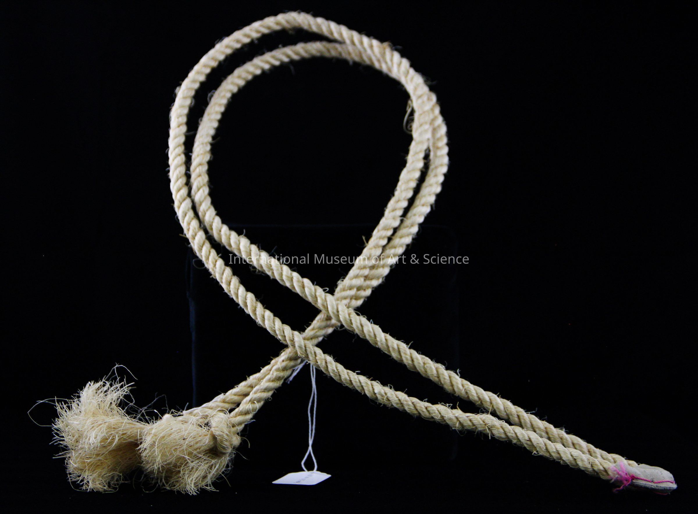 Hanging Straps For Hammock. Rope straps for suspending hammock (82.4.73) wrapped with short leather peice possibly with heavy cotton thread dyed pink. The ends of the rope are knotted and the remaining fibers are untwisted. The strap is doubled and is meant to be inserted through the hammock hoops.Made/Created