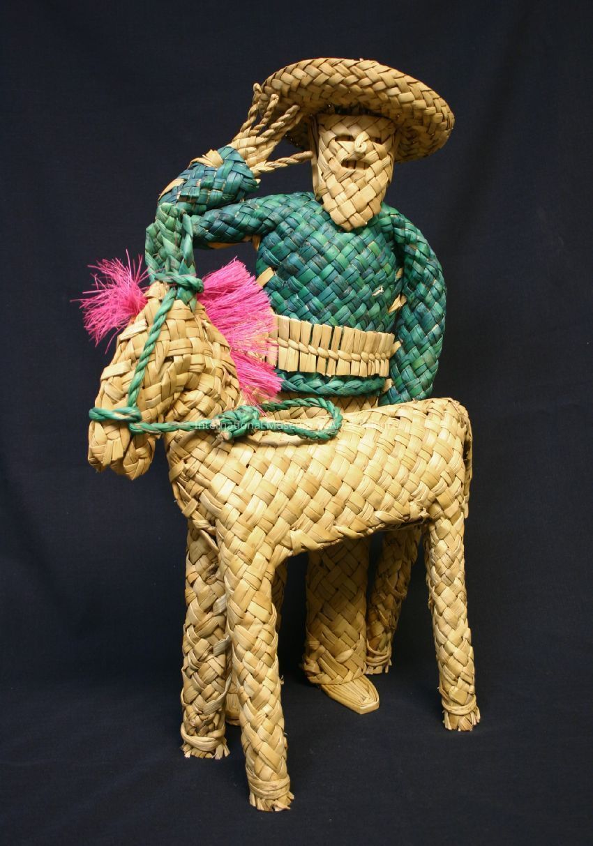 Man and horse. Man and horse of woven straw; upright position; man wearing hat, bag on his side, and pistol holder with bullets sheath; his right hand to ear, and overall natural straw color except for his shorts; his shirt painted green.Artwork Details
