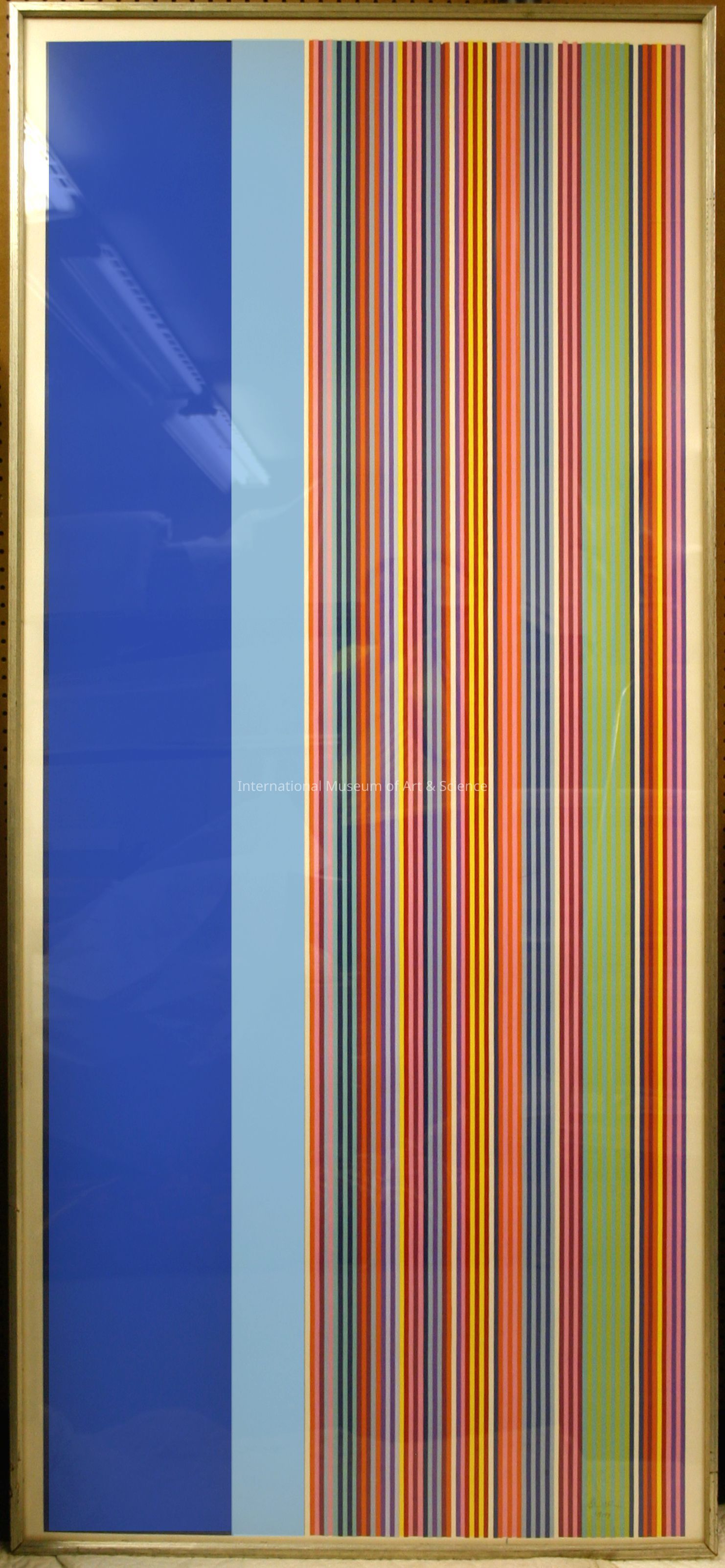"Stripes". Gene Davis. American. Silkscreen Lithrograph. c. 1970's. Multicolored vertical stripes, wide royal blue stripe of left end, followed by light blue stripe, not as wide then followed by stripes of different colors, each the same, very thin width.