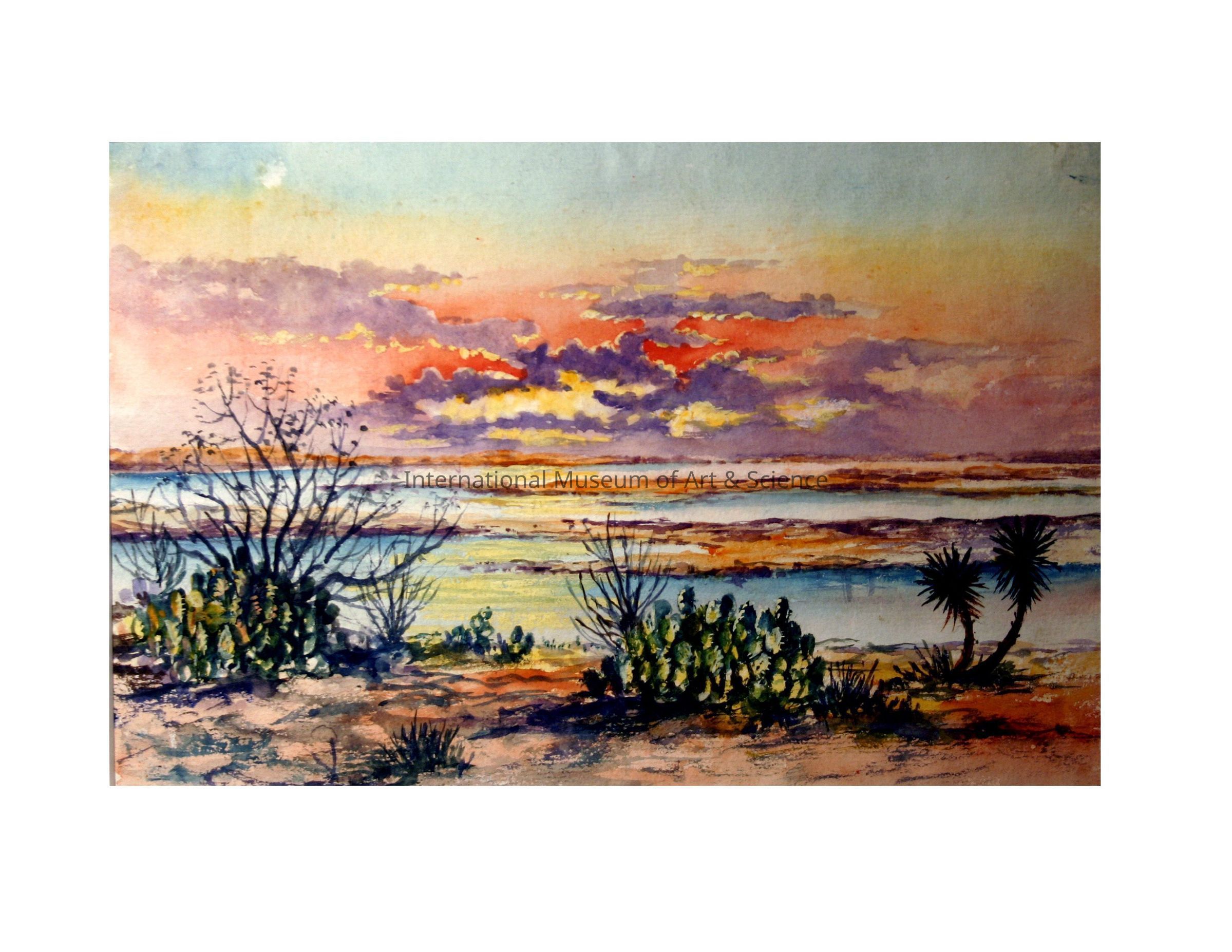Sunset from Red Head Hill. Landscape watercolor painting; desert scenery; colorful view of numerous green cactus plants; bare tree limbs, miniature twin palm trees, color bare distant land; sunset skies.Made/Created