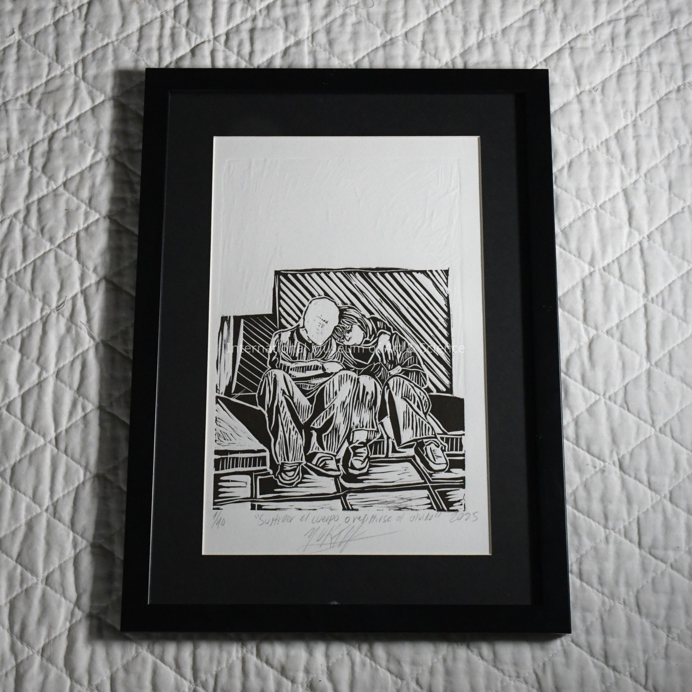 A linoleum block print on papel Canson, 320 grams. 39 x 28 centimeters. This framed block print image depicts a couple crouched and sitting at the edge of a curbside. One is leaning into the other, both facing down, in deep contemplation. There is also imagery of a tiled floor and layered background with contrasting patterns.Made/Created
