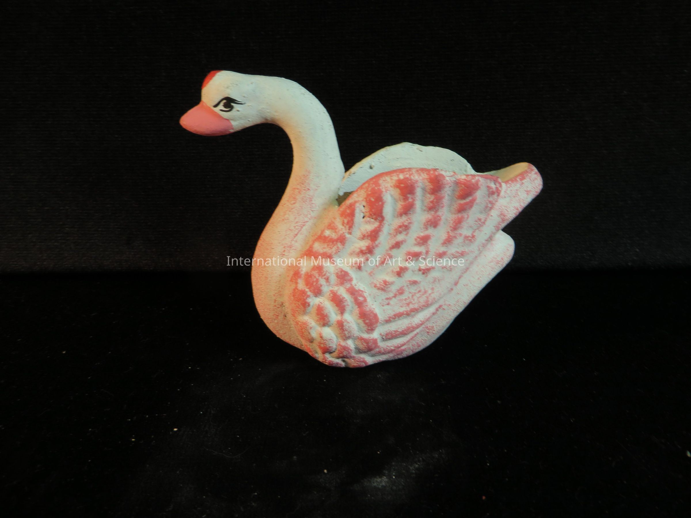A swan made of clay. The piece is painted pink on white. The bird has a red crown, pink beak, a long curved white neck, and black painted eyes. The piece has a shallow body like it may be a small planter or pot.Dimensions