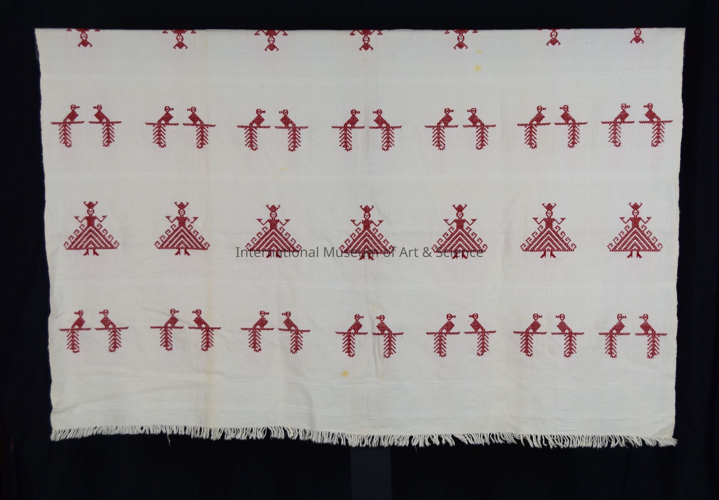 A cloth tablecoth. The piece is cream in color with fringed edge at the top and bottom. The piece is decorated in birds and figures with vases embroidered in red thread, which match the napkins. This piece is part of a set with 8 napkins and a tablecloth.Artwork Details