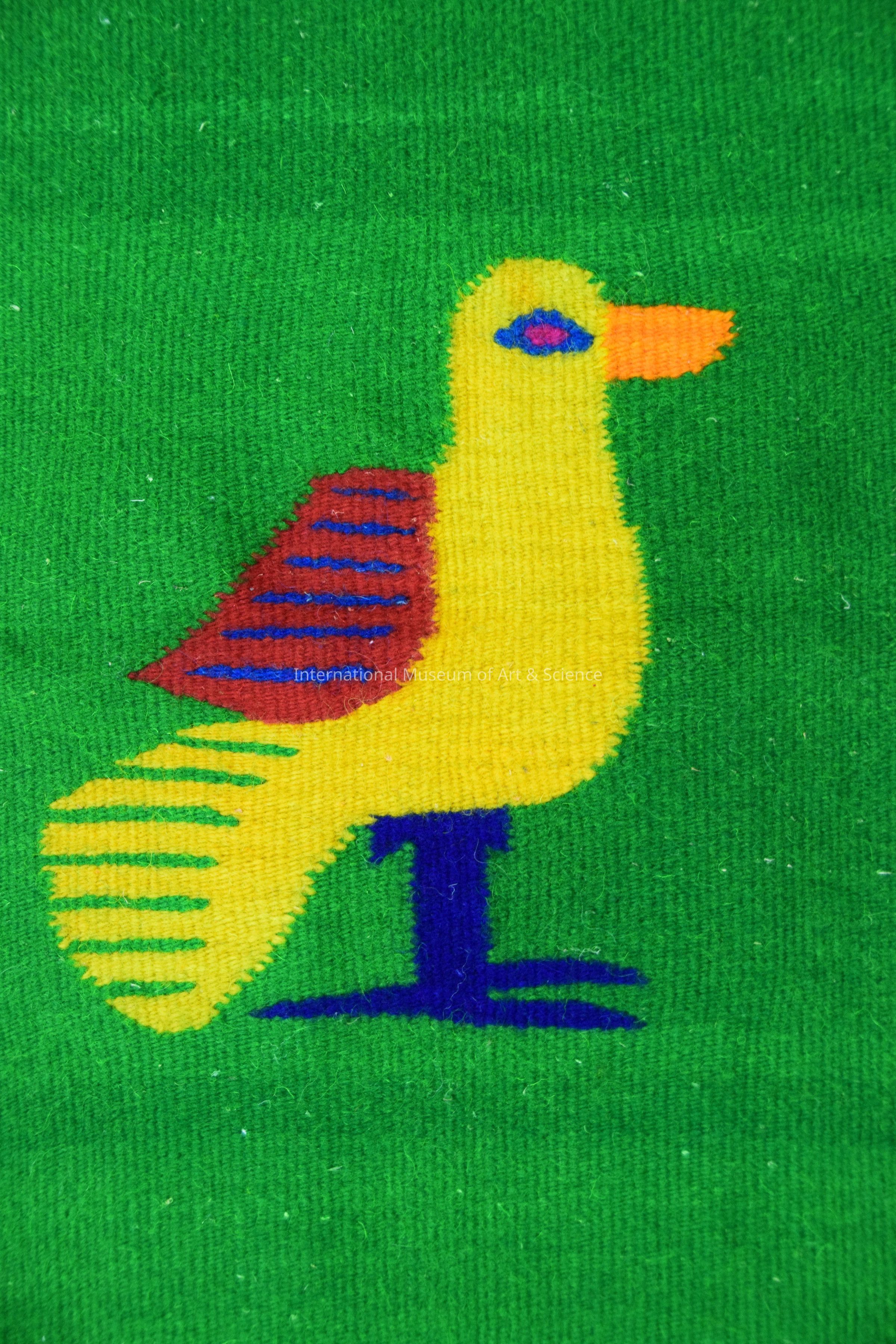 Tapestry. Thick, heavyweight wool textile piece depicting a stylized bird in its profile view. It is hand woven and rectangular (portrait orientation). The background yarn is a vibrant green, and the bird is woven in primary colors with a bright orange beak and pink iris. Its medium is hand-spun wool and its technique is tapestry weave (weft-faced plain weave). To be used as a wall hanging.Dimensions