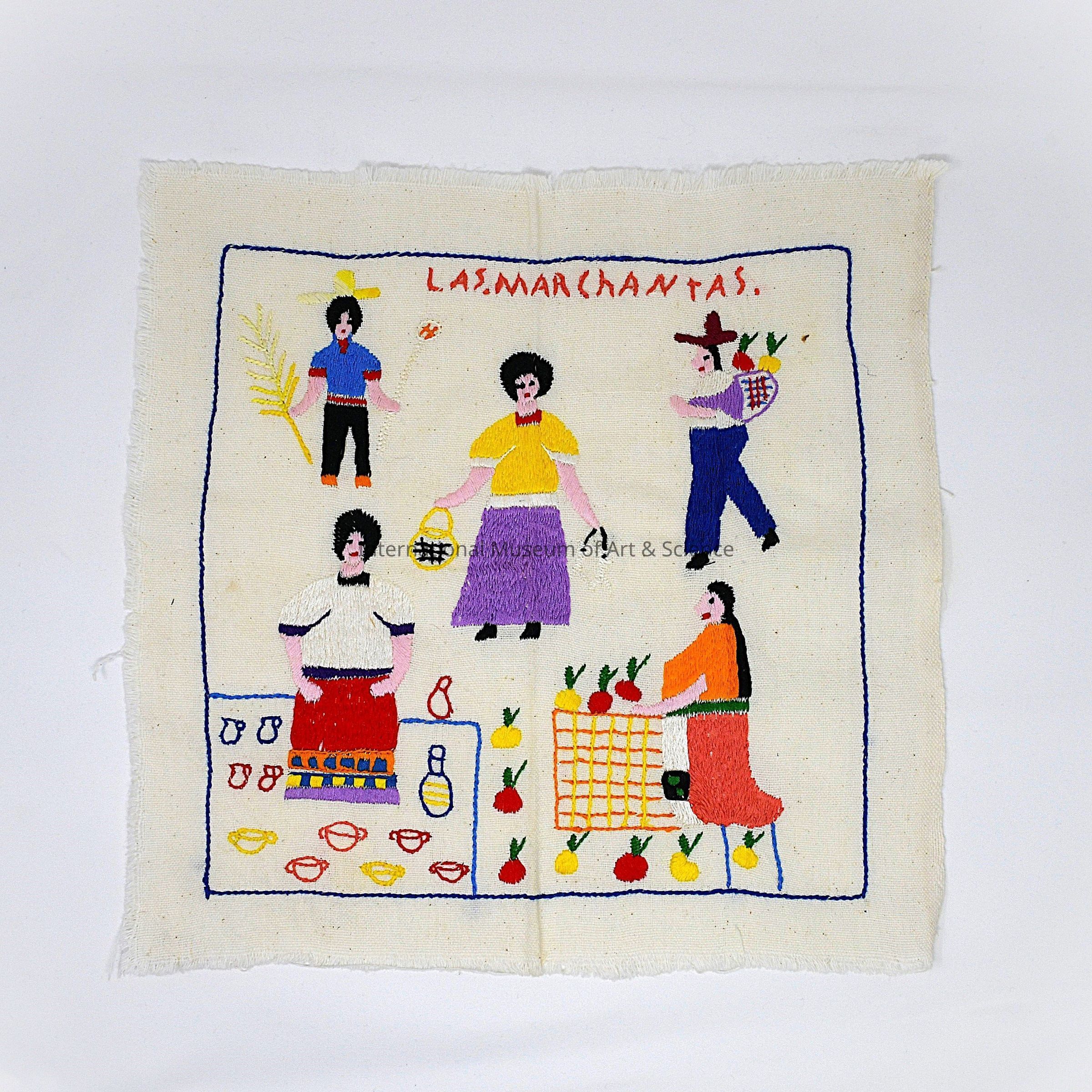 An embroidered piece of fabric. The piece is embroidered with three female figures and two male figures. All selling goods at a market. The top of the piece reads: "Las Marchantas" or "The Merchants".Artwork Details