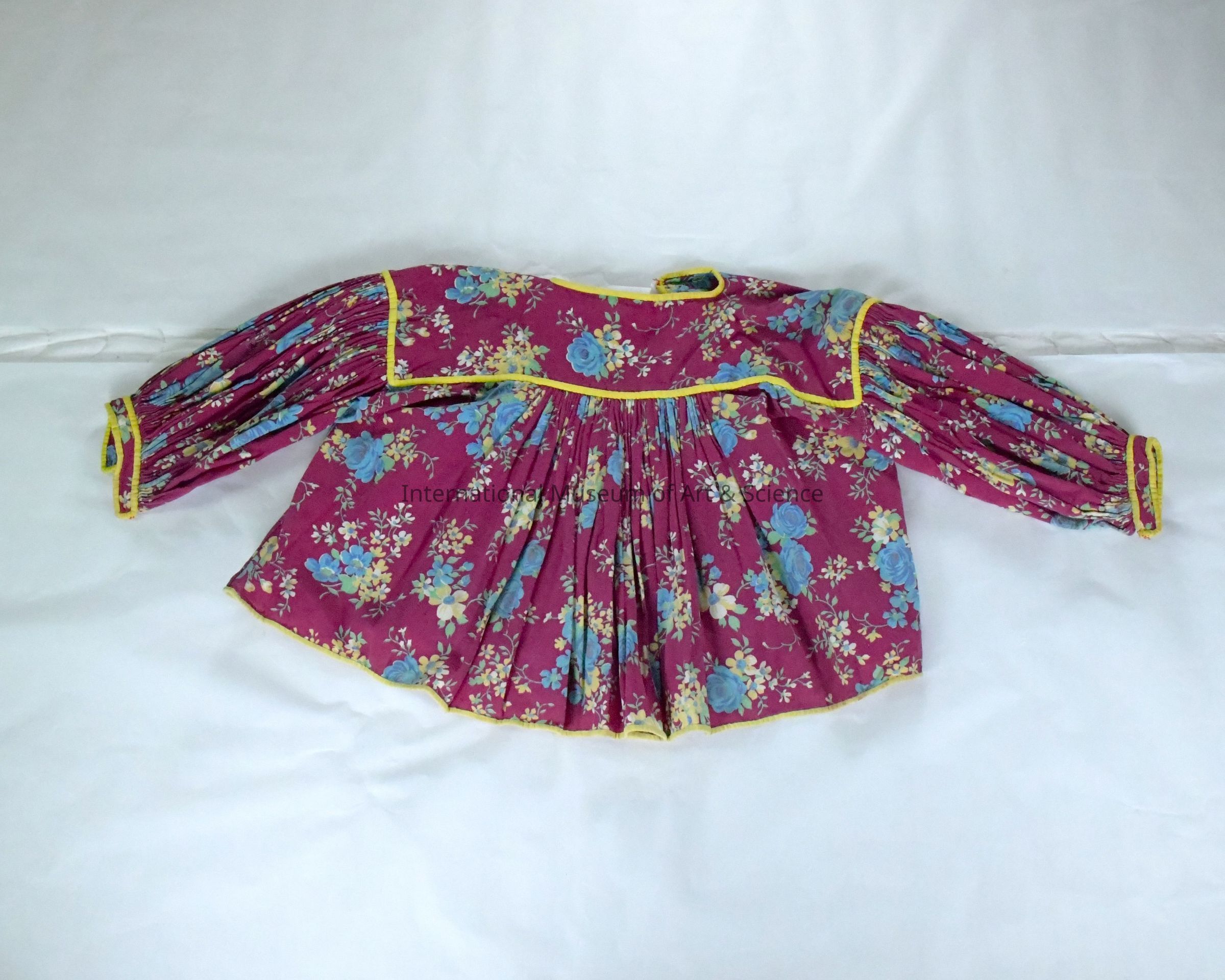 This ensemble includes a long-sleeved blouse and a matching gathered skirt, both made from high-quality printed cotton poplin in a magenta floral pattern with blue and yellow flowers. The construction features meticulous hand-finishing, particularly in the piping and pleating.