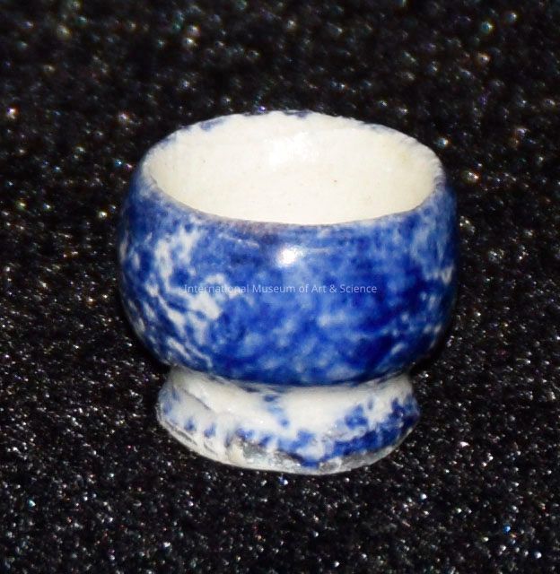 Miniature cup. Clay, ceramic blue "sponge"glaze on face, and matte white on bottom.Made/Created