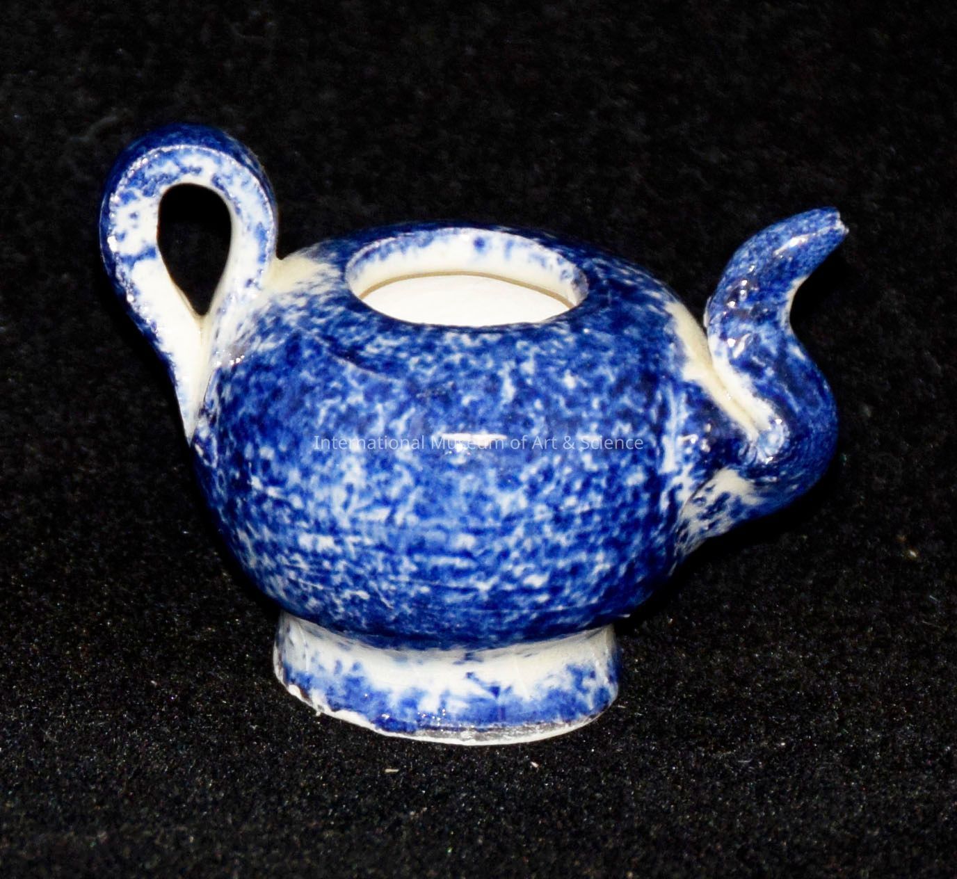 Miniature teapot. Clay ceramic, blue "sponge" glaze on exterior; shiny white on interior, and matte white on bottom.Made/Created