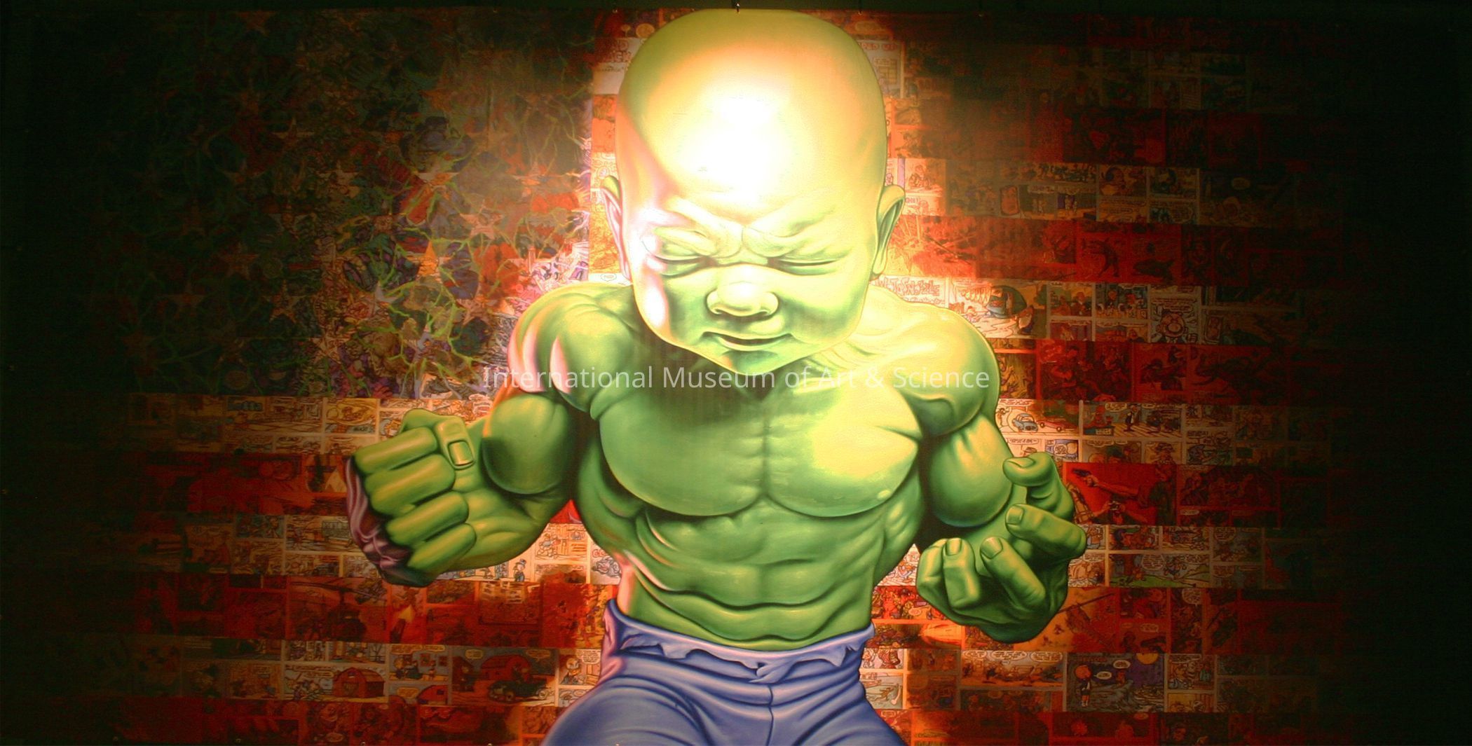 "The American Infantile." Ron English, American. Digital Print, 2011. Green Hulkboy with the background of the American flag composed of various cartoon comics