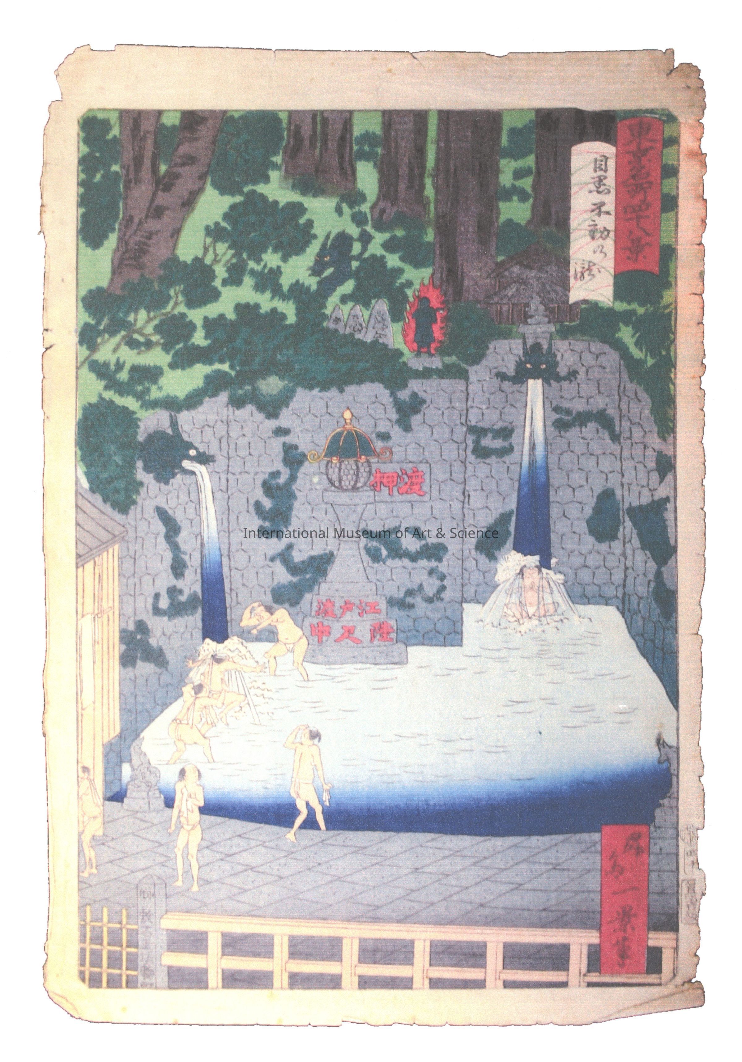A woodblock print from the series "48 Famous Scenes of Tokyo". The scene shows men bathing at a shrine hot spring.