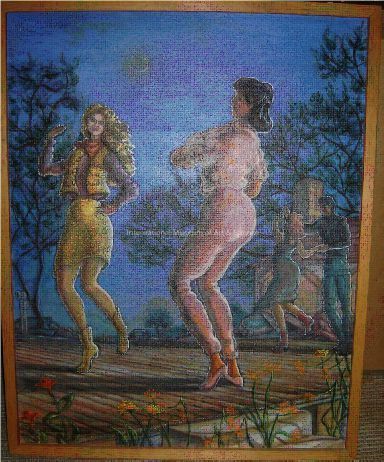 A paintng showing two women dancing with people in the background.Dimensions