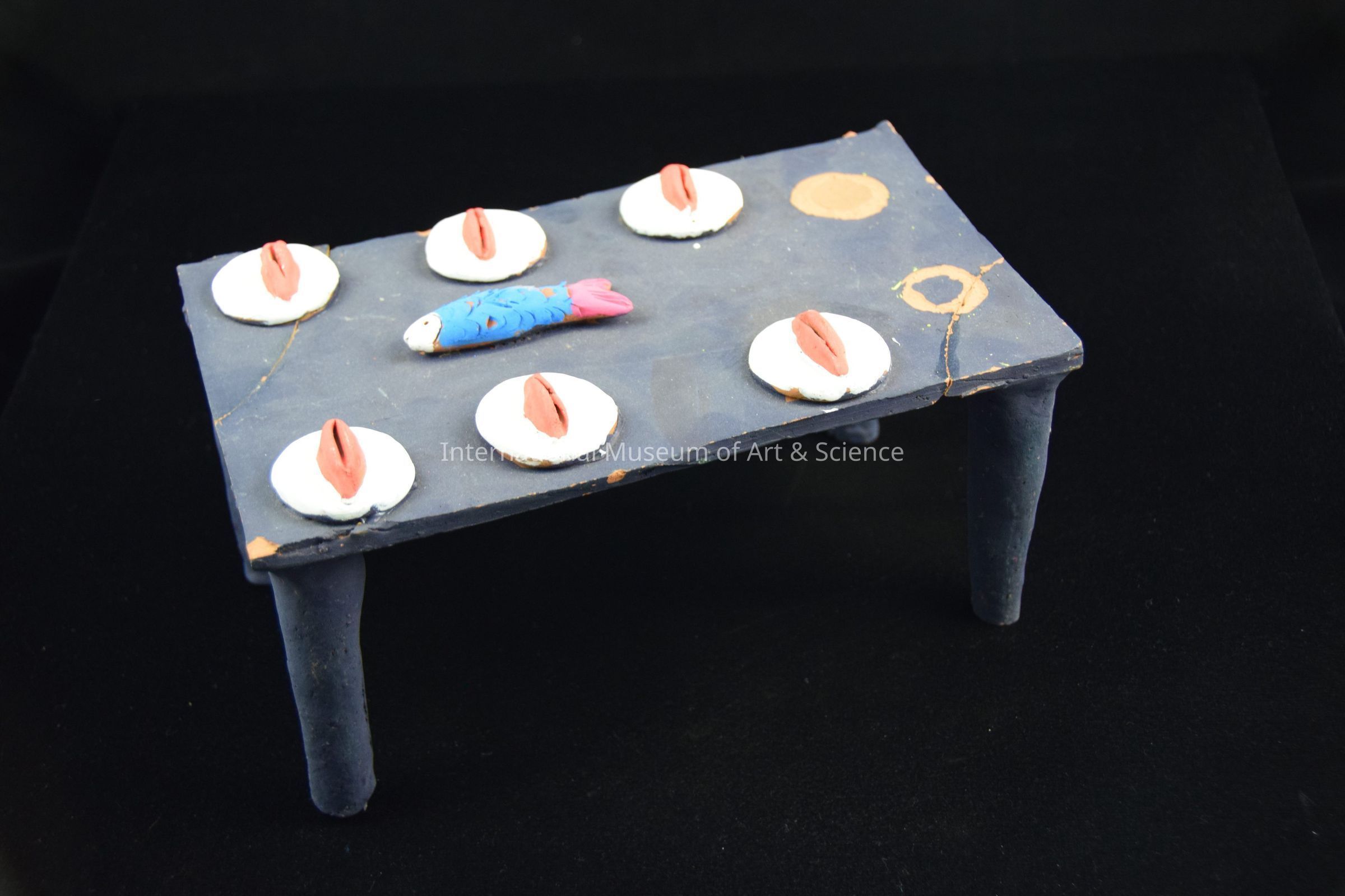 A ceramic figurine of a table. The table has been painted a dark grey. It has a fish in the center with 8 place settings around the edge. Two of the place settings are missing. This piece is part of a Last Supper scene with seated disciples, Christ figure, and tables with food and chairs.