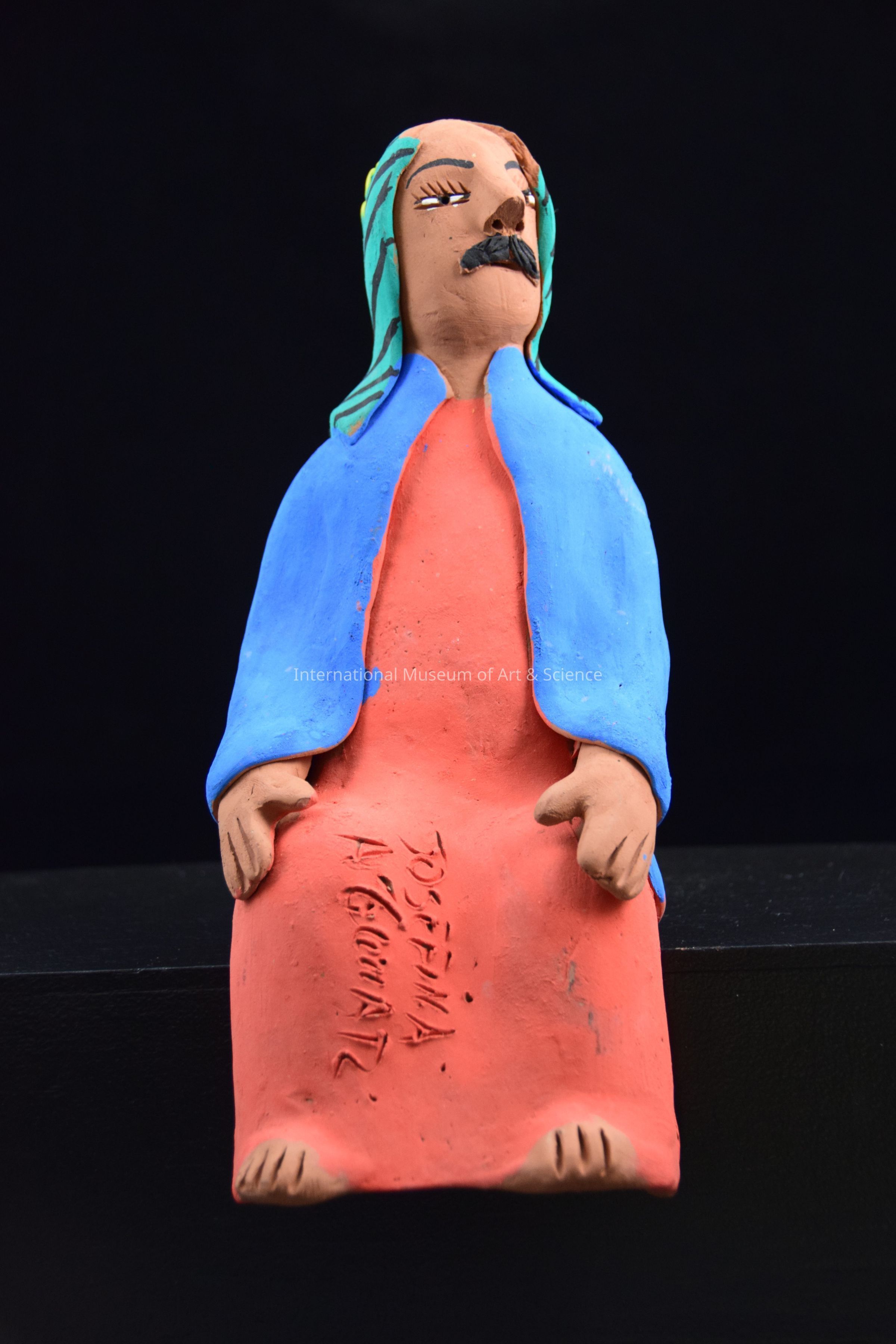 A ceramic figurine of a man. He is in a sitting position. He is wearing an orange robe and a green and black stripped head covering. He has a black moustache. He is one of Jesus' disciples from a Last Supper Scene. This piece is part of a Last Supper scene with seated disciples, Christ figure, and tables with food and chairs.