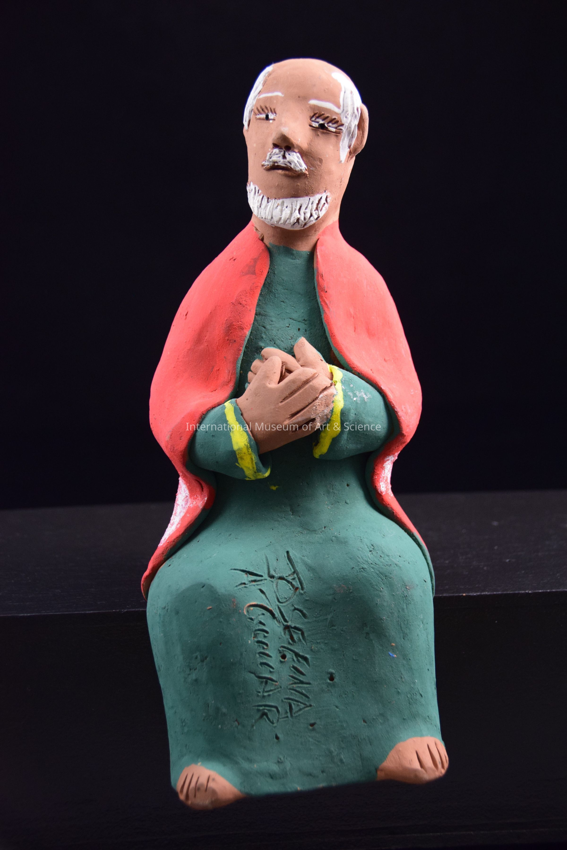 A ceramic figurine of a man. He is in a sitting position. He is wearing a dark dreen robe and a red cape. He has a white moustache and beard, he is balding. He is one of Jesus' disciples from a Last Supper Scene. This piece is part of a Last Supper scene with seated disciples, Christ figure, and tables with food and chairs.